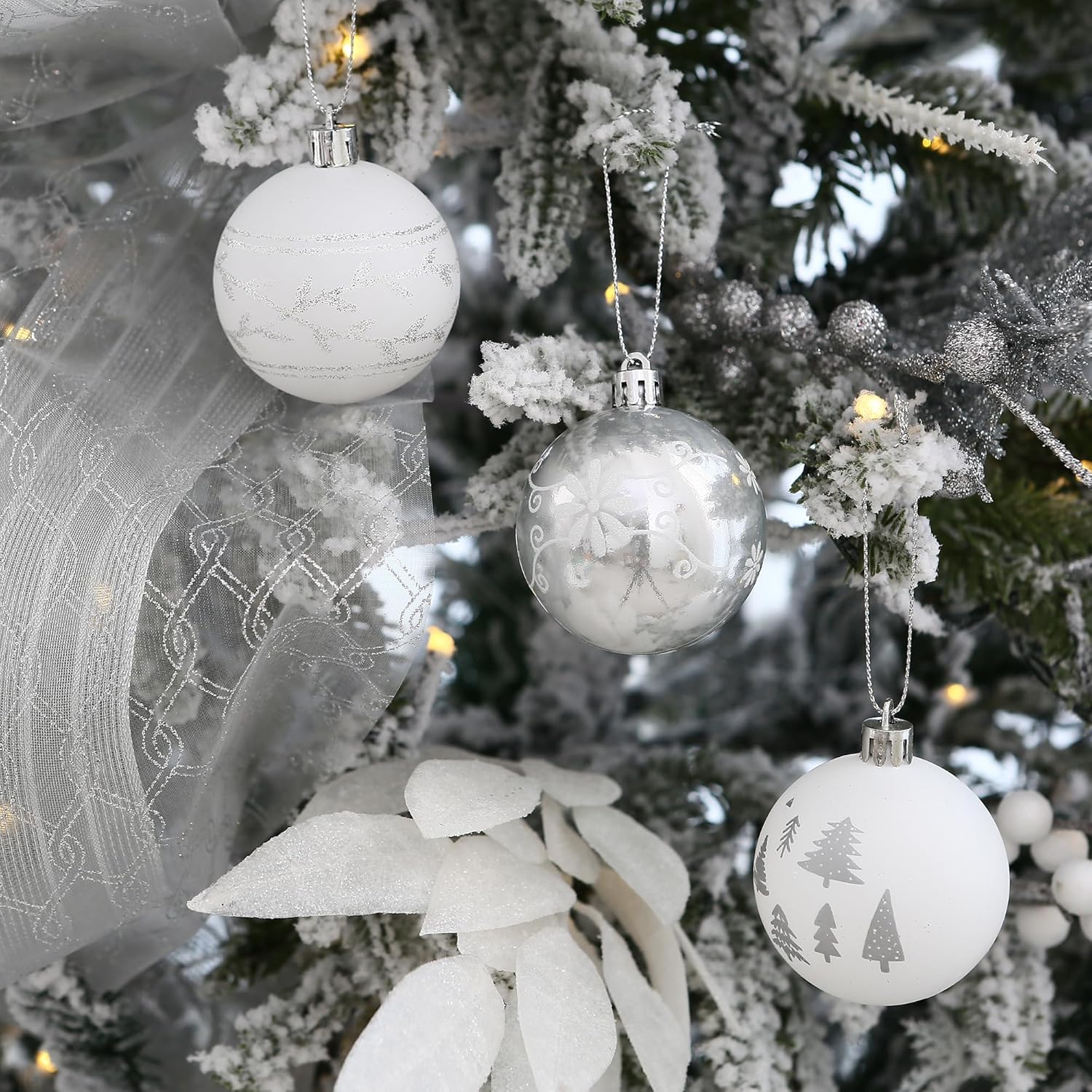 Sea Team 60mm/2.36" Delicate Contrast Color Theme Painting & Glittering Christmas Tree Pendants Decorative Hanging Christmas Baubles Balls Ornaments Set - 30 Pieces (Silver & White)