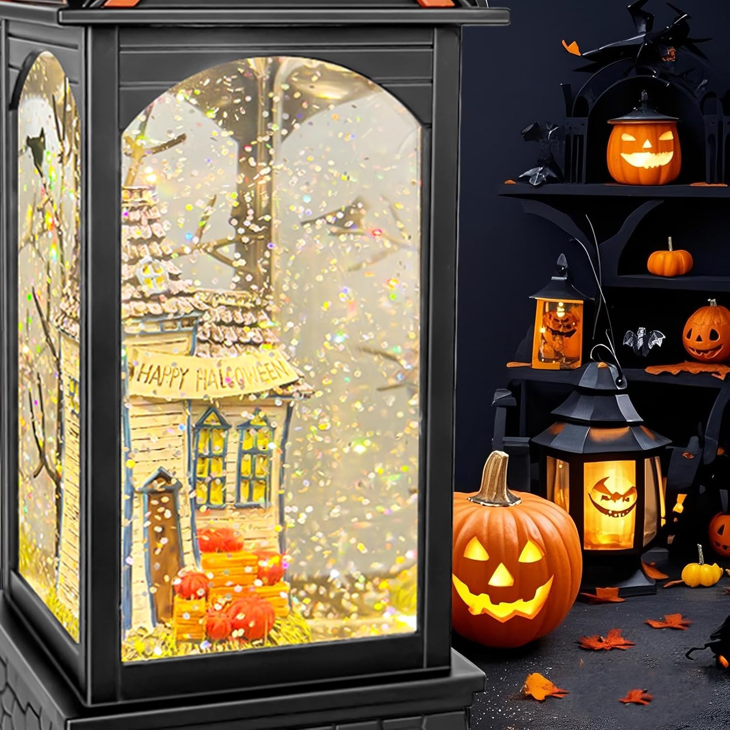 - Spooky House Charm: Transform your home into a Halloween haven with our enchanting snow globe lantern. Inside, a quaint, spooky house is surrounded by a flurry of sparkling snow, all aglow with a warm golden light. The built-in fan creates a whimsical swirl of snowflakes, adding a magical touch to your Halloween decor.