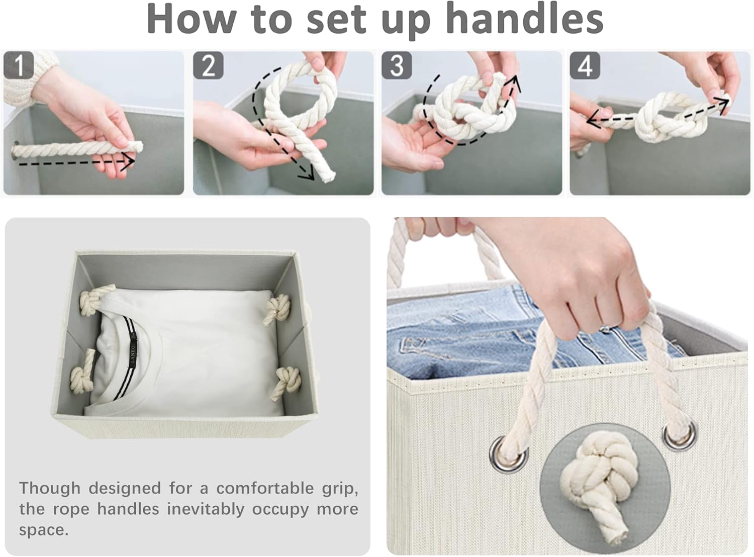 - The storage basket with 2 soft rope handles can support a weight of up to 30 pounds.
