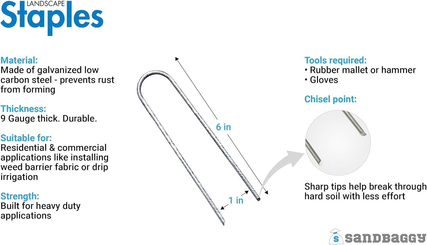 - #1 BEST SELLING BRAND: Sandbaggy landscape staples can be found securing landscape fabric & irrigation piping on job sites, national parks, and airports across America. That’s why we are the #1 best selling brand of landscape staples on the Internet, with over 25 million Sandbaggy landscape staples installed across this great country.