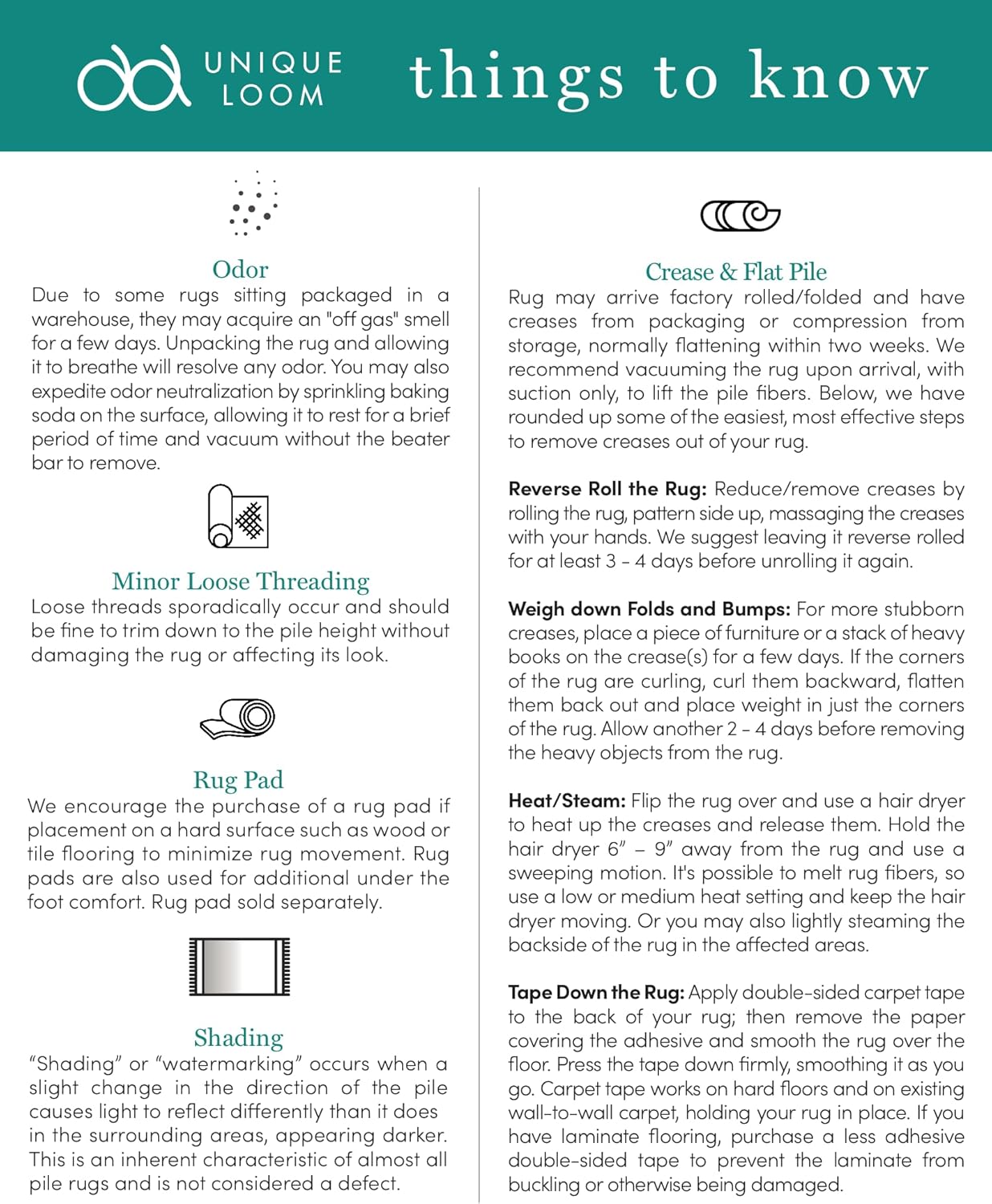 - In case of creases - roll the rug in the opposite direction, while applying pressure to the rug - for example, take the edge of the rug and flip it on top of itself slightly where there is a crease or bump, and slowly pull the rug back to its place, while applying a downward pressure on the crease