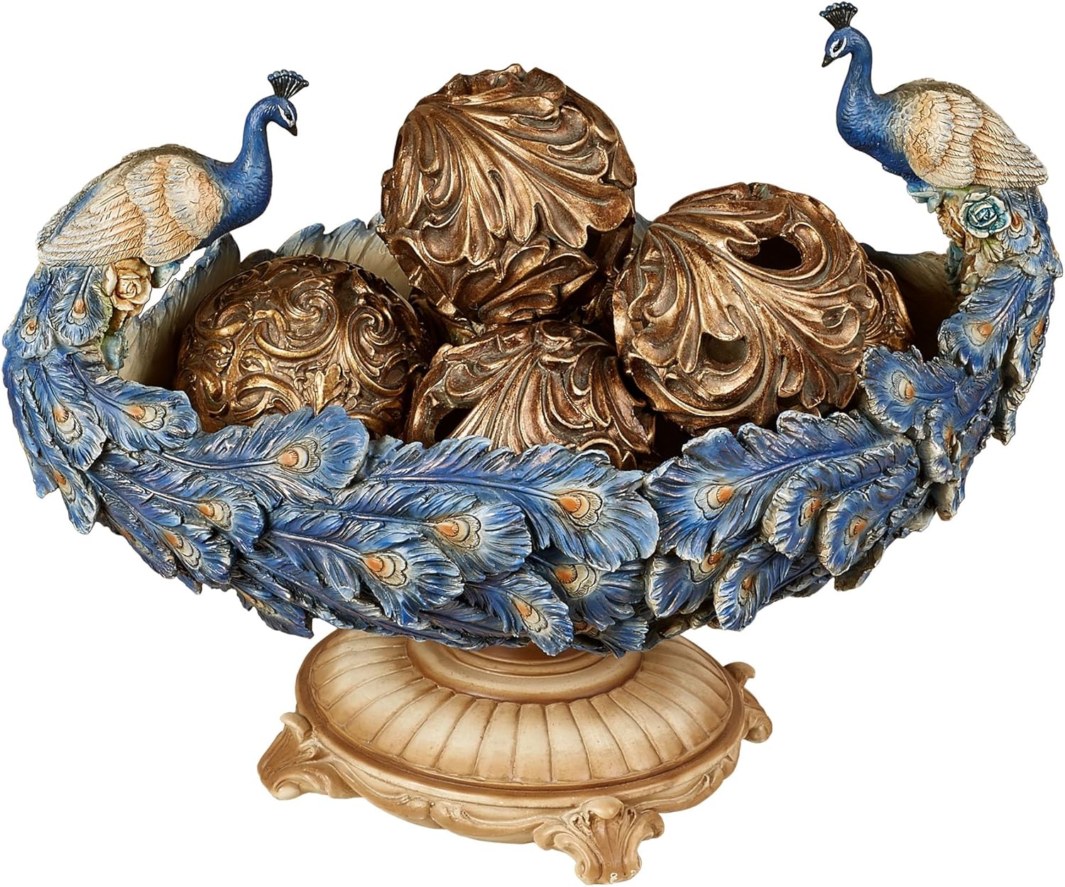 - Luxe Plumes elegantly adorn this peacock centerpiece bowl with distinctive style. This handpainted, resin accent has dusty aqua and caramel roses along with blue peacock tails that create the shaped bowl. The ornate base is beige. For decorative use only. Centerpiece measures 16.5"Wx10"Dx12"H. Orbs are not included. Designed by Touch of Class(R)! Shaped centerpiece bowl Features peacocks with winding tail feathers Has an ornate beige base Beautifully painted by hand Shown with the