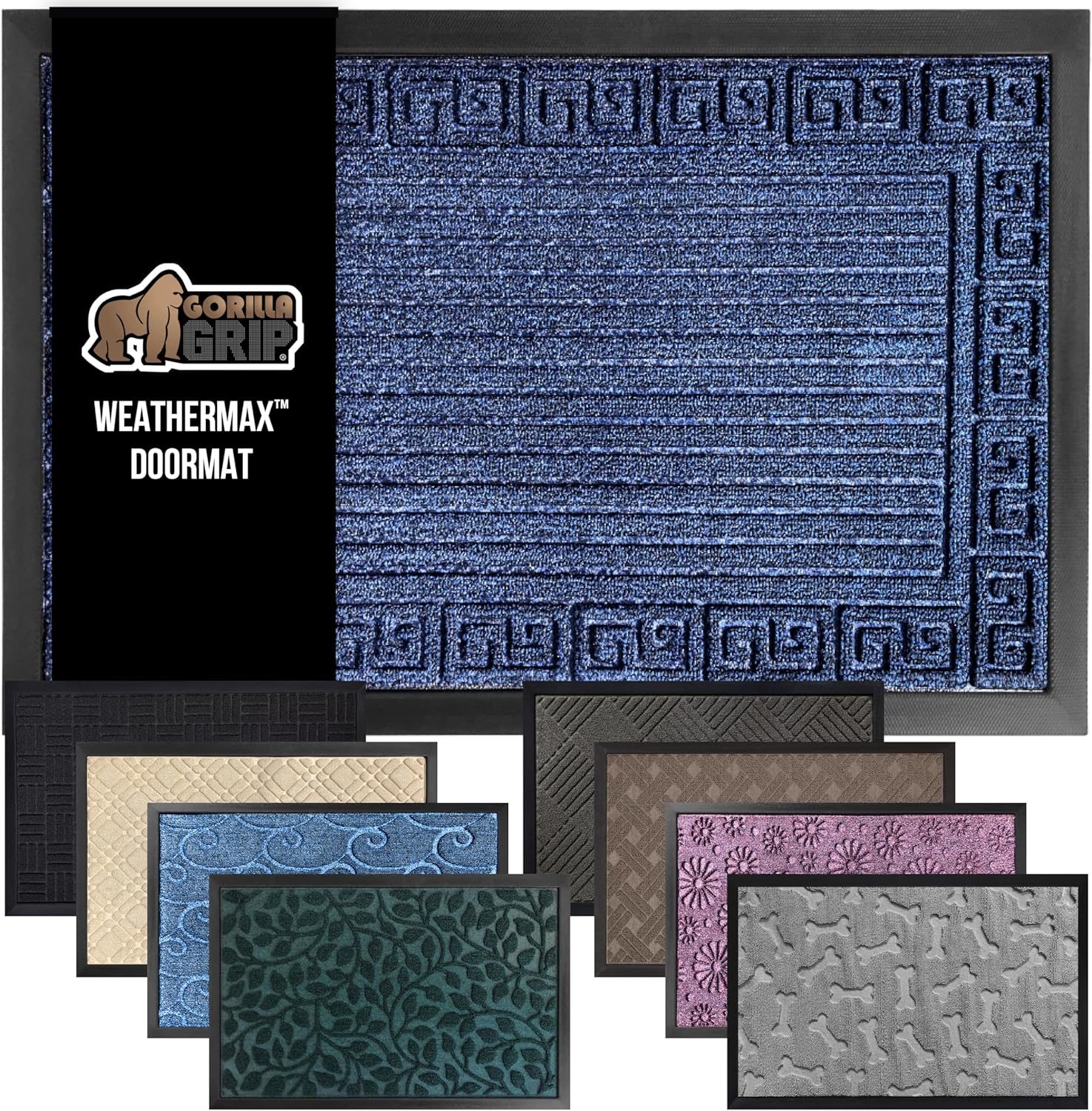 GORILLA GRIP 100% Waterproof All-Season WeatherMax Doormat 35x23, US Designed Natural Rubber, Stain and Fade Resistant, Low Profile Indoor Outdoor Door Mats, Easy Clean Patio Mat, Navy Greek Keys
