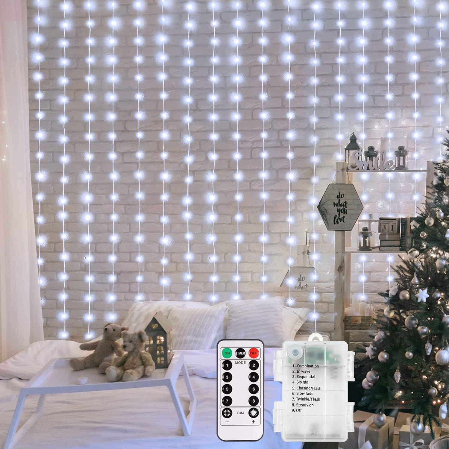 echosari Curtain Lights Battery Operated, 200 LED Curtain Fairy Lights 6.6×6.6ft with Remote Timer Outdoor Wall Light Fully Waterproof for Wedding Backdrops Bedroom Decor (Cool White)