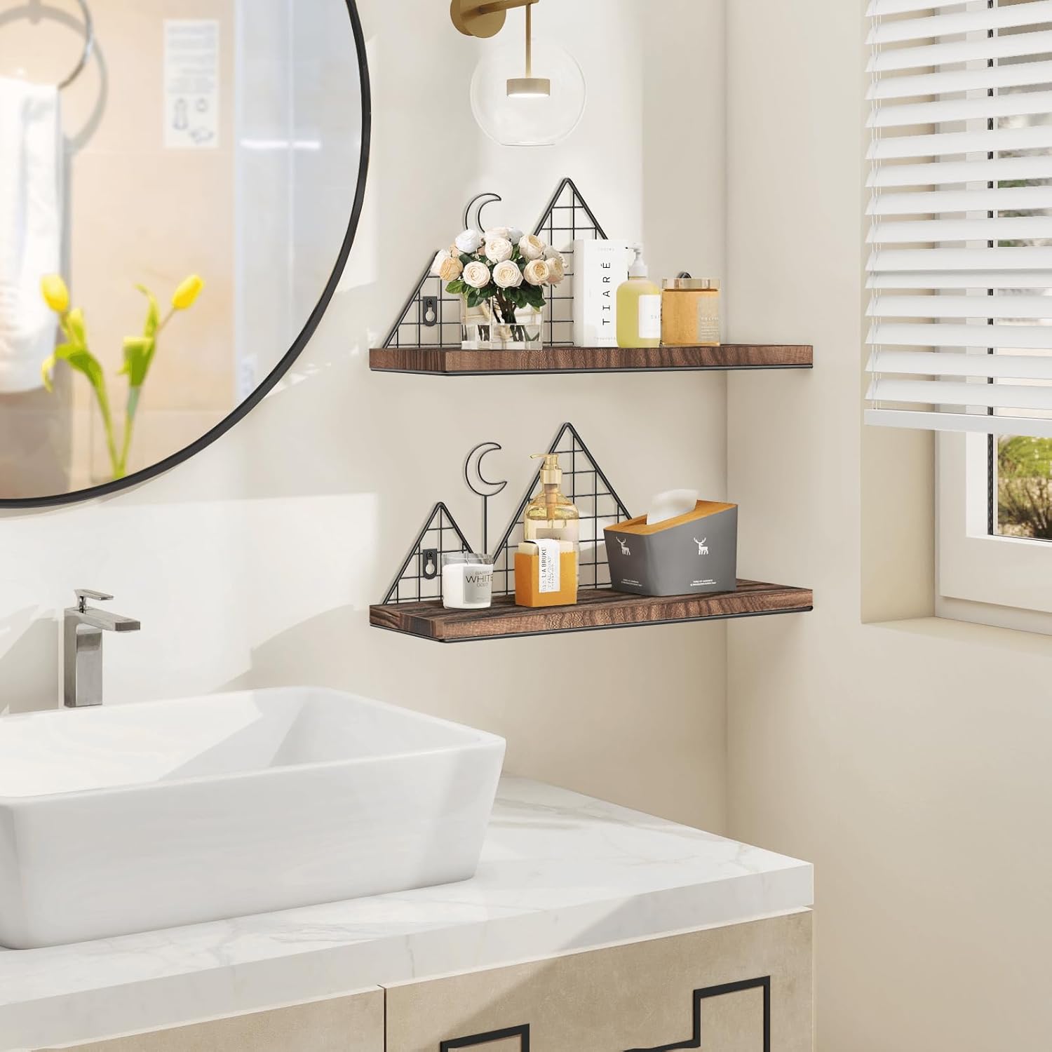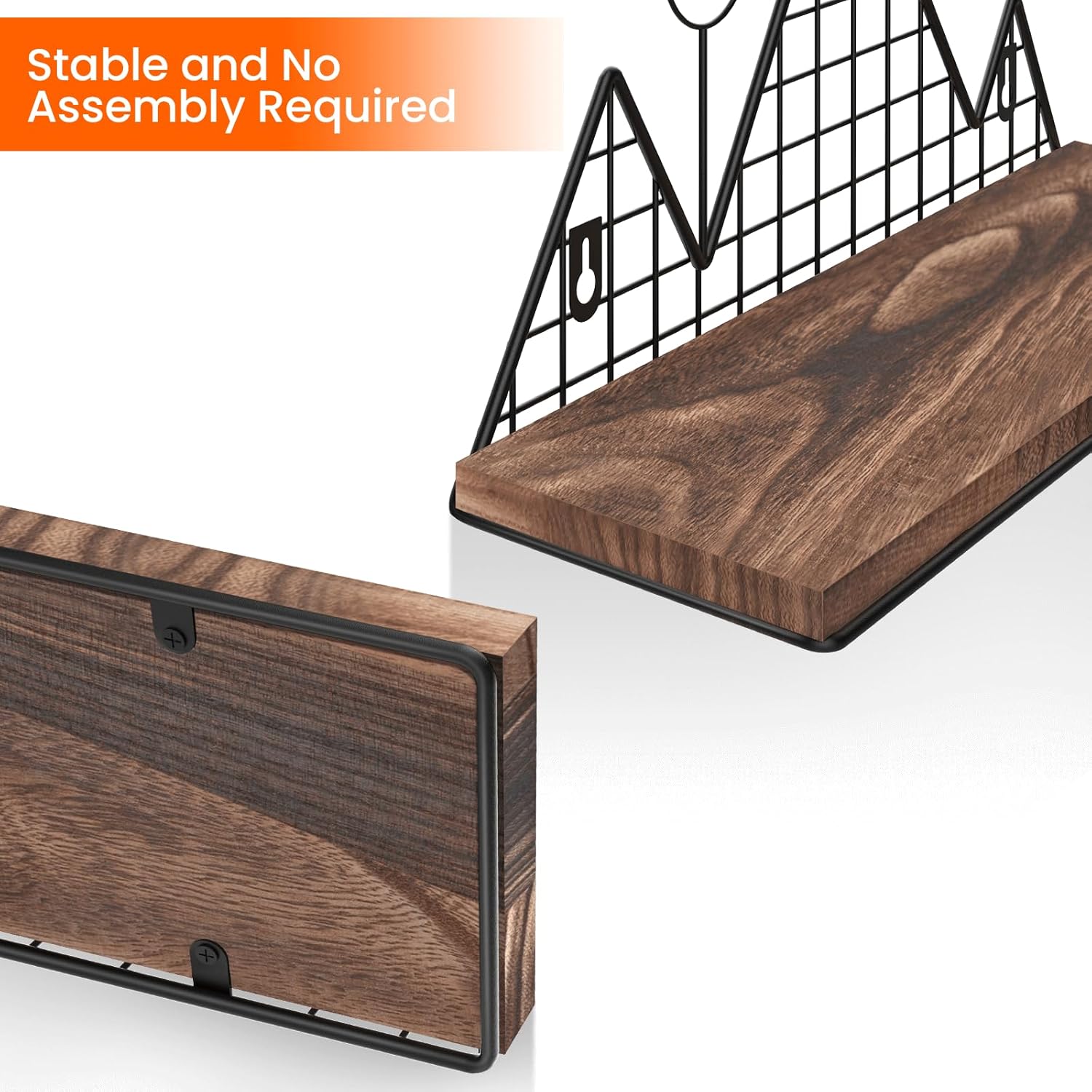 Homode Floating Shelves, Set of 2 Mountain Wall Shelves, Rustic Wood Display Storage Shelf with Metal Wire, Geometric Decor for Bathroom, Nursery, Bedroom, Office, Brown and Black