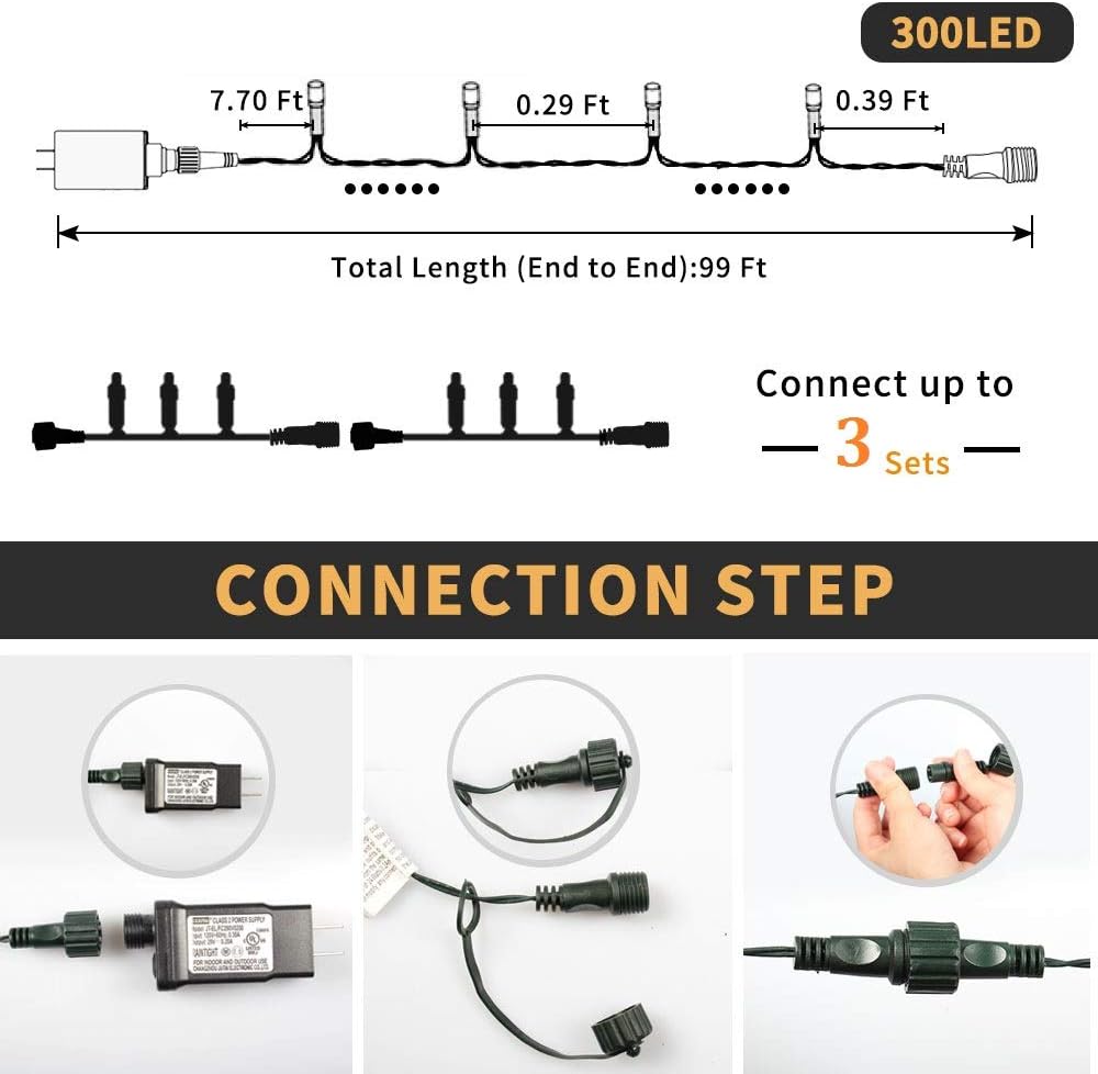 - 105FT/300LED & End to End Expandable:This super long 105FT fairy string lights with 300LED warm white individual bulbs. And each Christmas light has end-to-end connection that allows up to 3 strands connected together to illuminate a wider range. They will brighten up the dark corner for happiness atmosphere inside or outside.