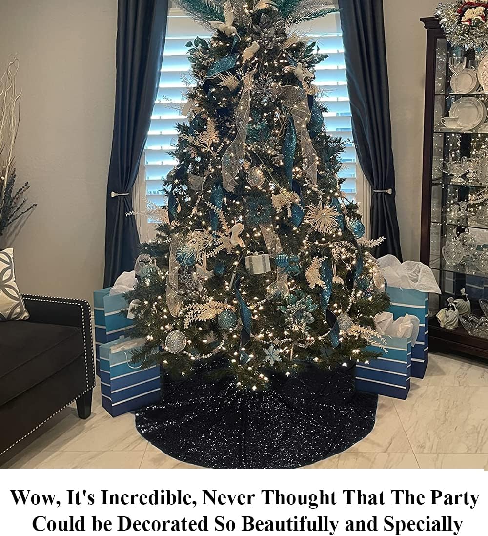 - √ SEQUIN TREE SKIRT: 1pc 24inch black sequined Christmas tree skirt. The small Christmas tree skirt is perfect for under 4' trees small/slim/pencel trees(depending on fullness).