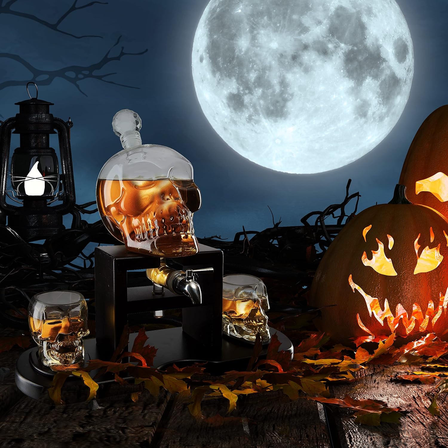 - HIGHEST QUALITY: Complete with 1 skull-shaped decanter, 2-skull shaped shot glasses and a wooden tray holder. This set is perfect for Halloween, pirate-themed parties, or bachelor parties. Crafted of fine crystal for timeless shine and durability, guests won't be able to resist talking about this set long after they're done drinking. Great for vodka, liquor, whiskey, and more, this is one set that will make you stand out