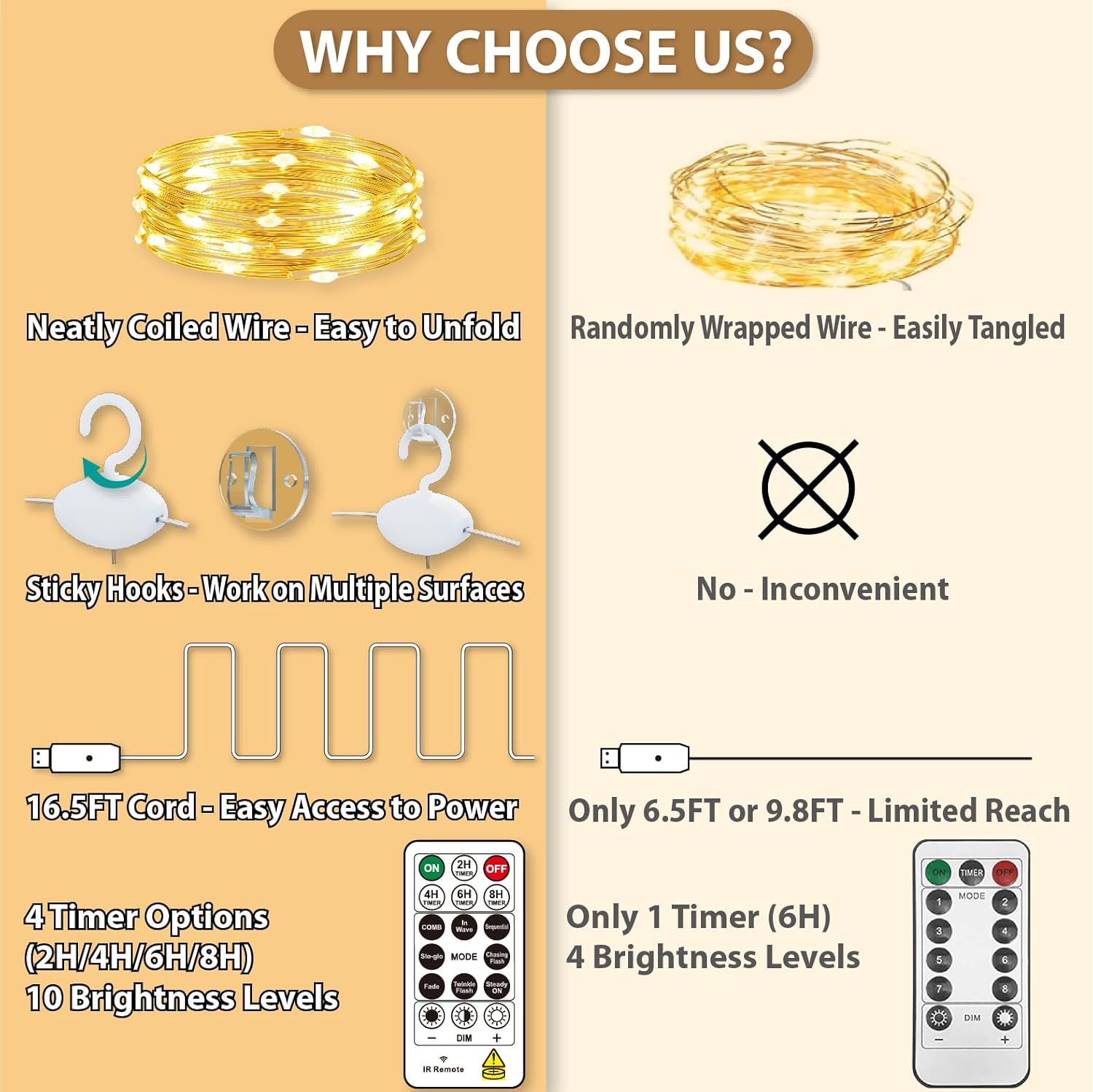 - Safety: Operated with 5V Low Voltage, And will not get overheated, totally NO risk to cause any electric shock or fire hazard; Very Sturdy and supper safe to touch; Waterproof fairy lights is perfect for indoor and outdoor decorations: wedding, backdrop, party, home, window, wall, bedroom etc; Unravel easily with no tangles