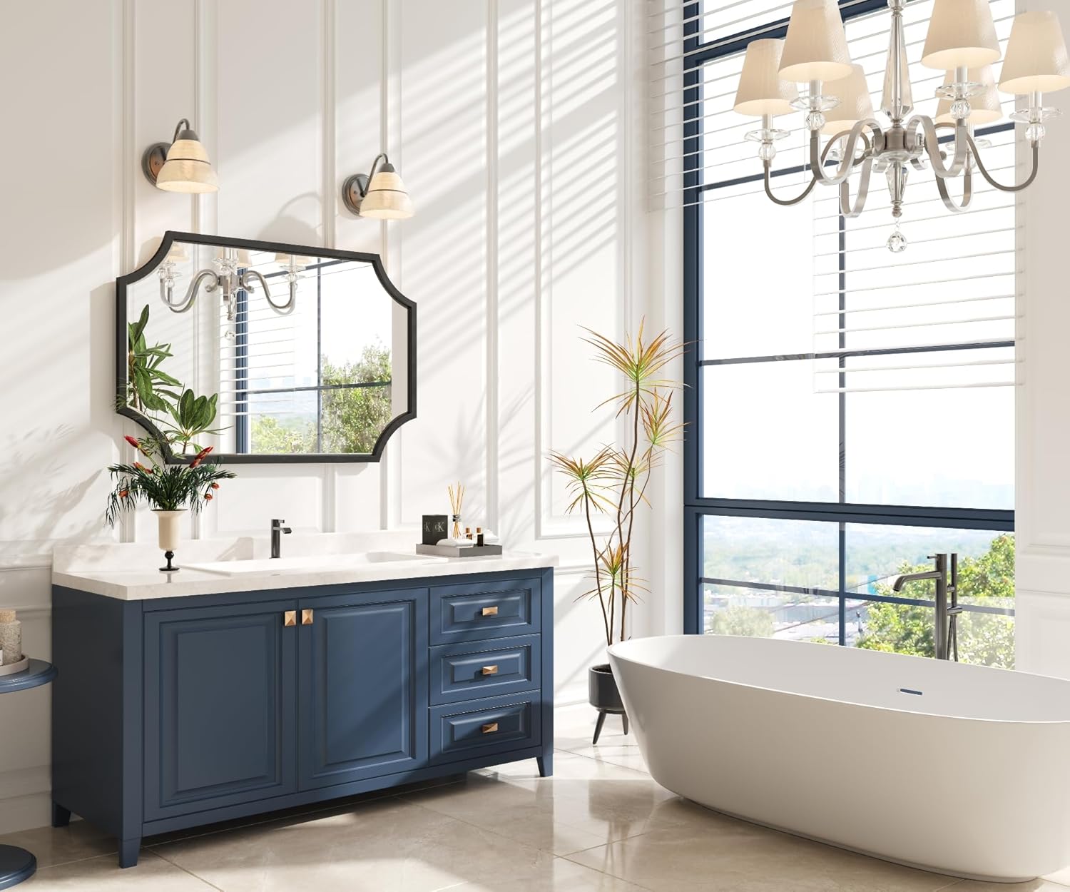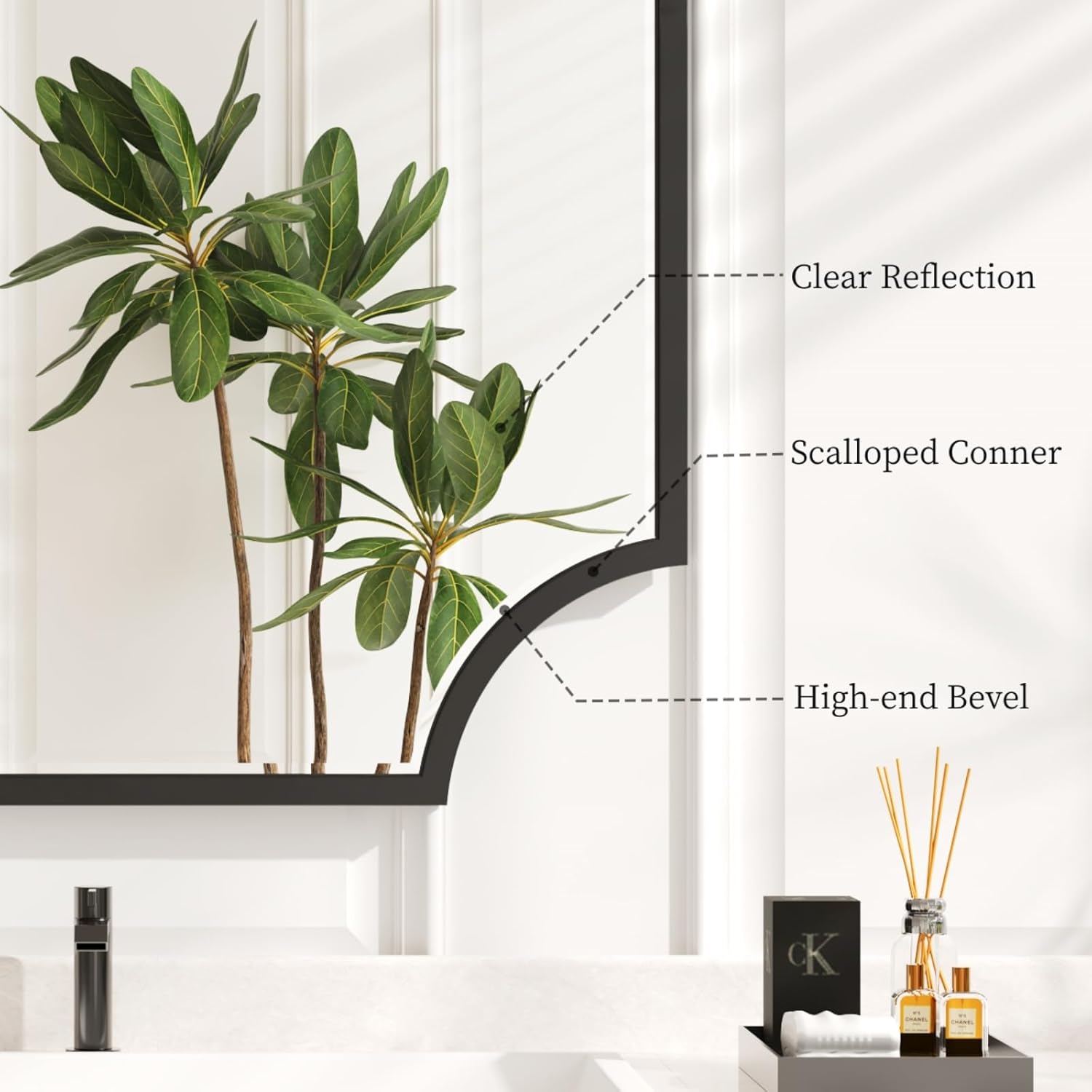 - SOPHISTICATED DESIGN: The mirror frame features an elegant scalloped corner shape. It's a traditional mirror style, but it also gives the mirror a simple and modern look, and it can be placed over a small cabinet or fireplace or hung in your bathroom, living room, dinning room, or kitchen.