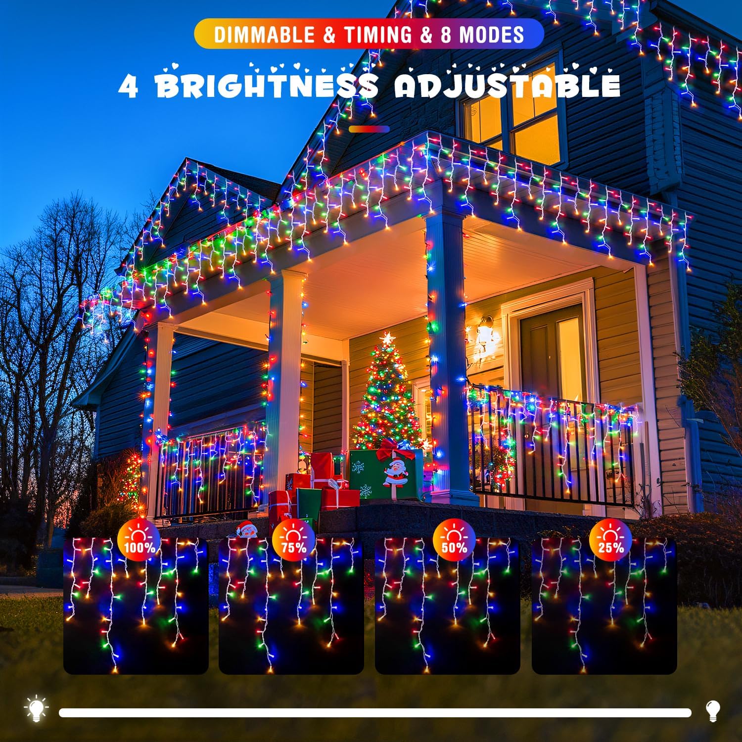 - 【8 LIGHTING MODES & TIMER FUNCTION 】 Multiple selection of light patterns. the different settings are a lot of fun. Fascinating multicolor icicle lights for my porch with colorful lighting options! They look gorgeous in Mode 'Chasing/Flash' on our patio. Of course Mode ‘Twinkle/flash’ is very Christmas. Our icicle lights also have timing function, which automatically turns on for 6 hours and turns off for 18 hours
