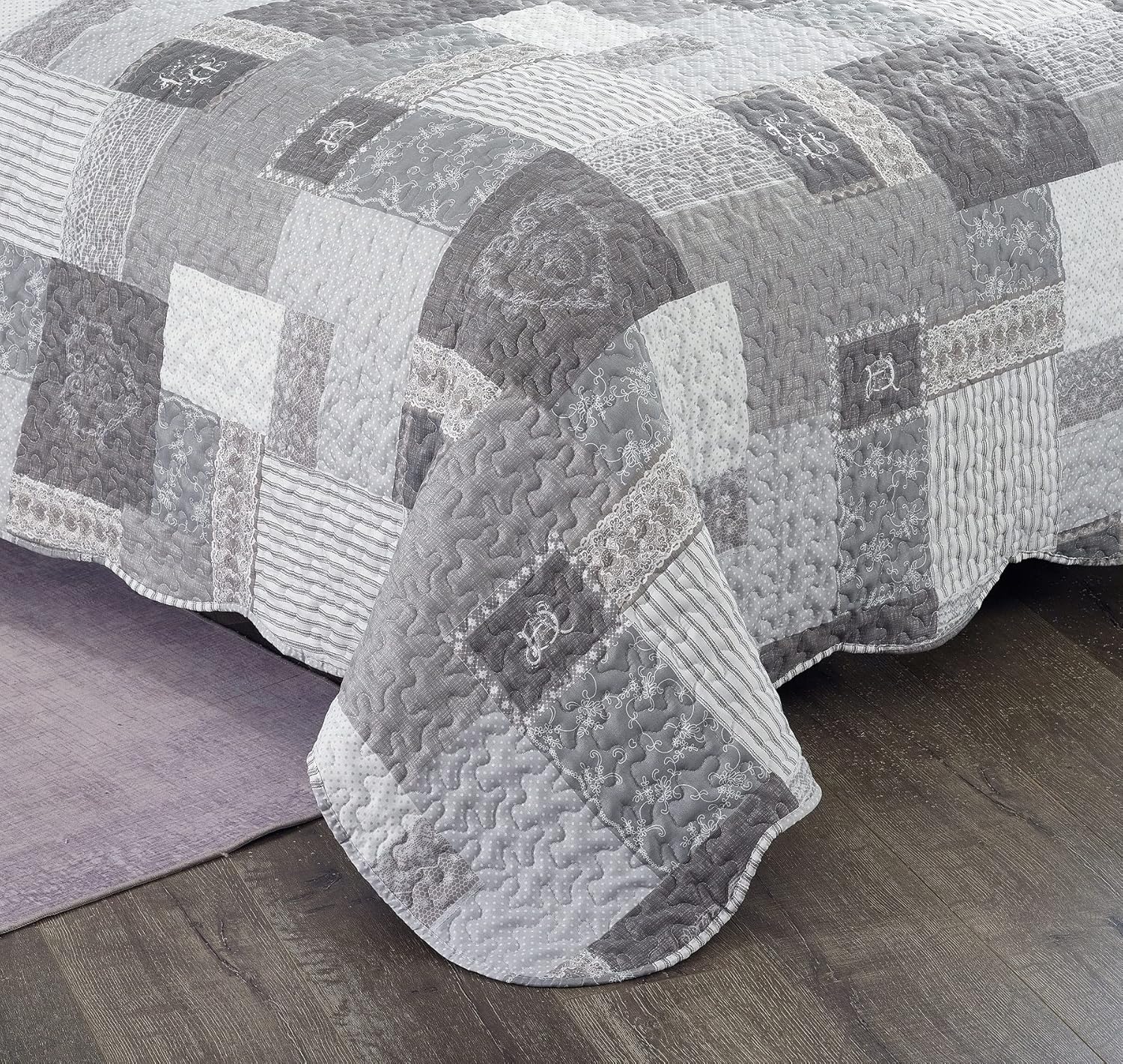 Brilliant Sunshine Grey Heart Love, Floral and Lace Patchwork, 2-Piece Quilt Set with 1 Sham, Reversible Bedspread, Soft Lightweight Coverlet, All-Season, Twin, Grey
