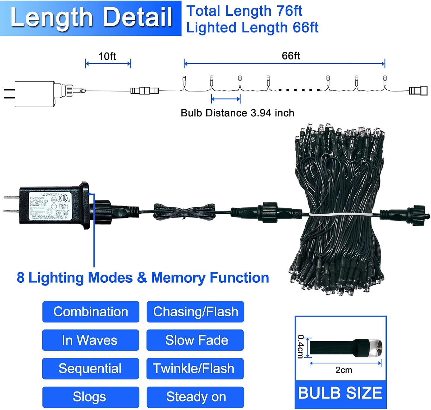 - 【Extendable Blue Outdoor Lights】Total Length: 76ft, lighted length: 66ft, lead wire length: 10ft, space between LEDs: 3.94 inch, wire color: green. Blue string Lights, with male and female safe plugs, could be extended up to 5 sets. Ideal for outdoor and indoor use of Christmas.