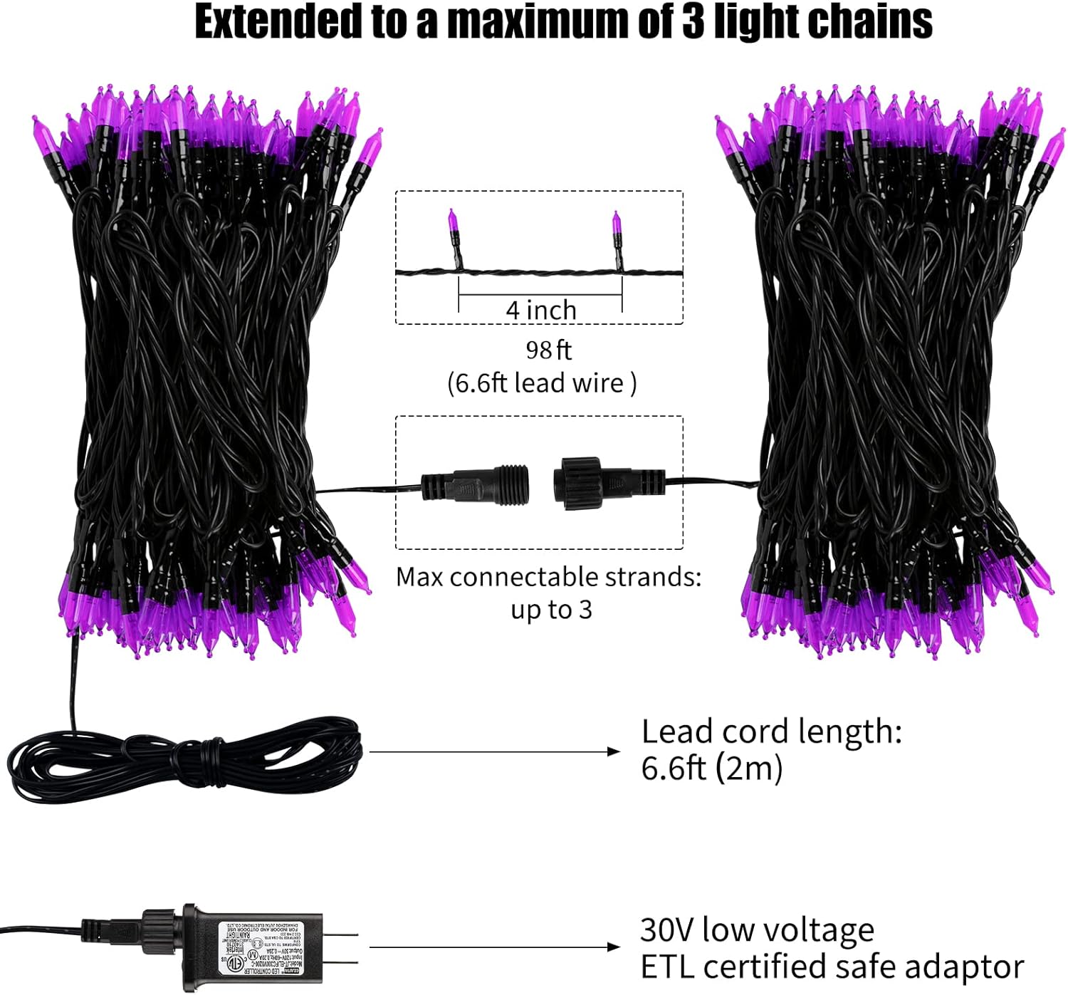- End to end extendable: Maximum connectable 3 strands to customize your need for large area and festival decorations, 9.8 inches tail cord with key designed female connector for quick and easy connection