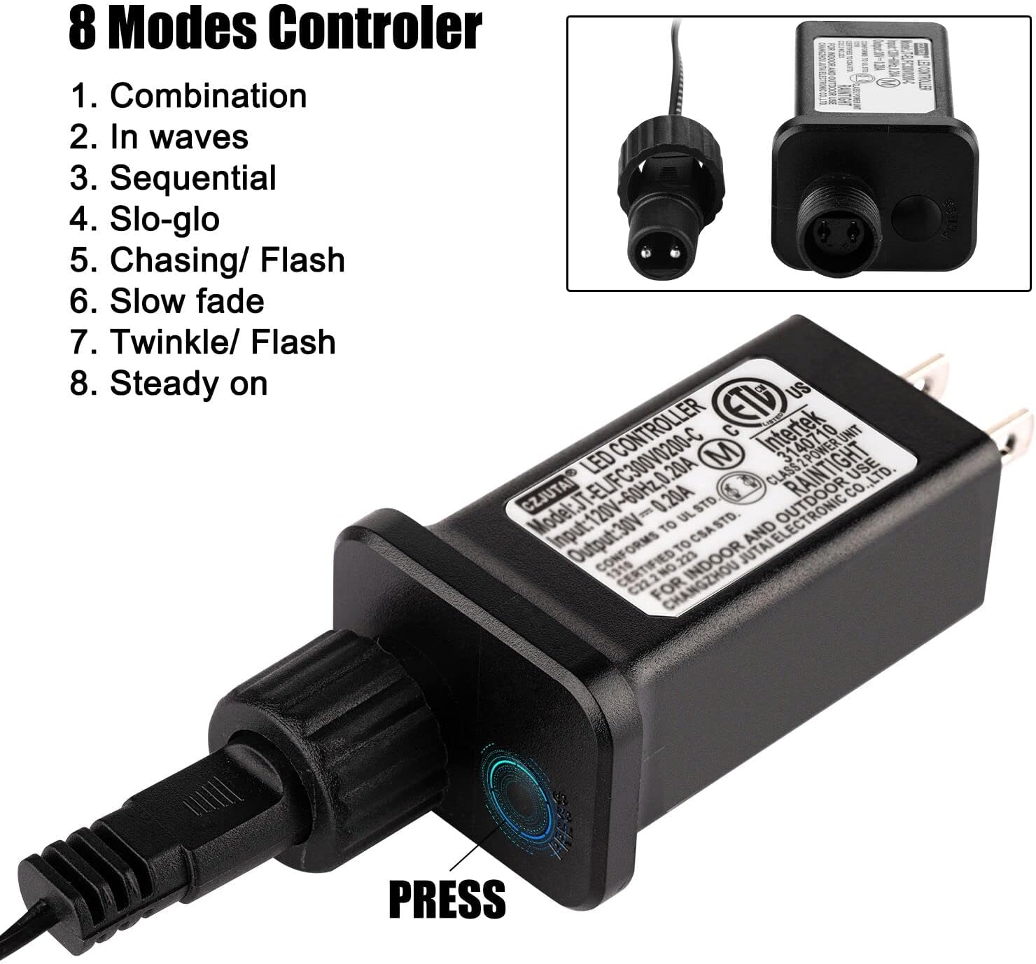 - 8 fantastic flashing modes: Press the press button on ac adapter repeatedly to select 1. combination, 2. in waves, 3. sequential, 4. slow glow, 5. chasing or flash, 6. slow fade, 7 .twinkle or flash or 8. steady on working mode