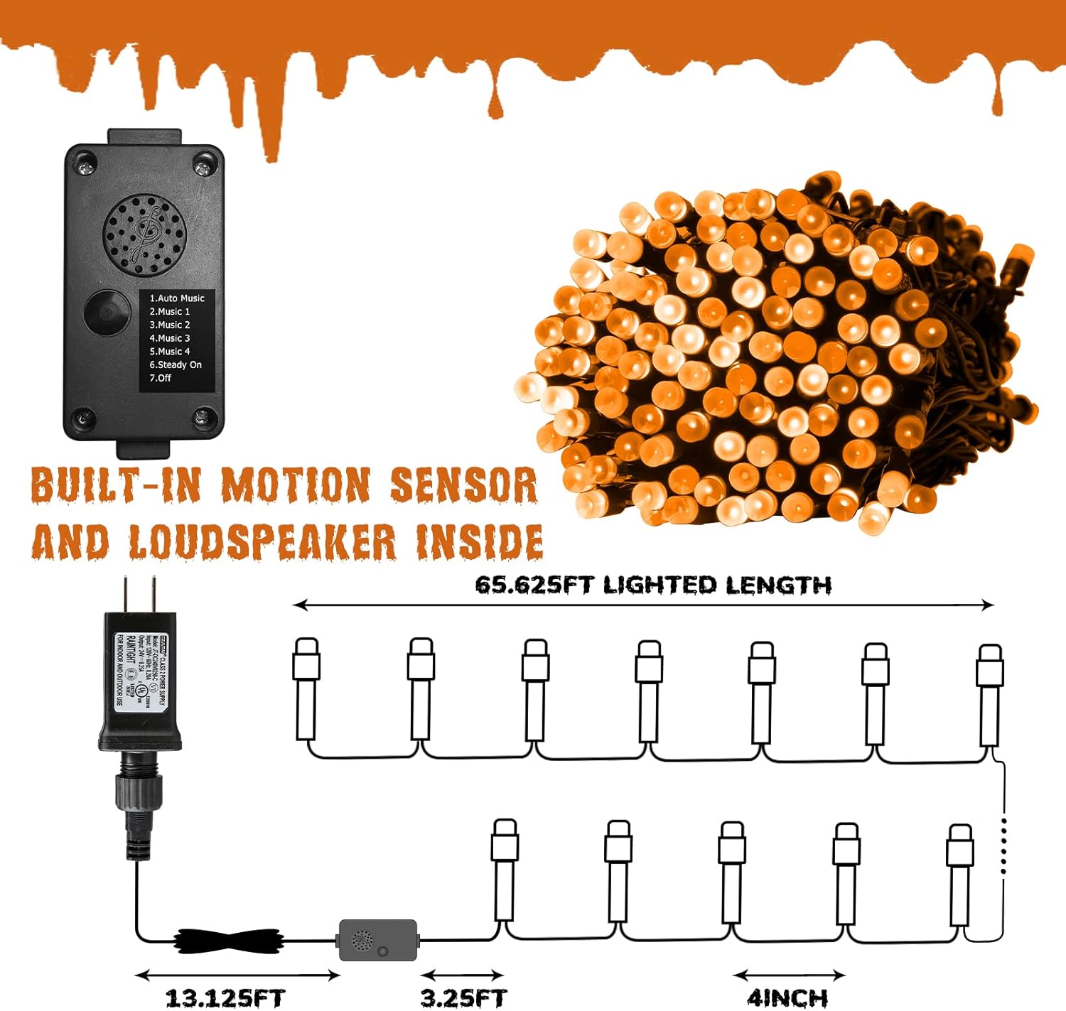 - 6 Lighting Modes: Auto, Music One, Music Two, Music Three, Music Four, Steady On modes create a creepy seasonal display.