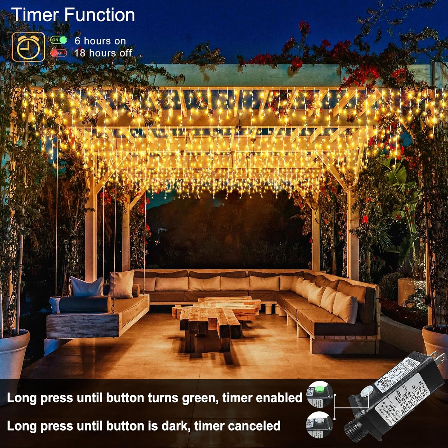 - Upgraded 8 Modes Icicle Lights for Outside: The Christmas Lights outdoor have 8 selections of light pattern: 1.Combination 2.In Waves 3.Sequential 4.Slo-Glo 5.Chasing/Flash 6.Slow Fade 7.Twinkle/Flash 8.Steady On. Different lighting effects are controlled by the button on the plug. These beautiful and vibrant warm white Christmas lights will bring you a lot of festive atmosphere.