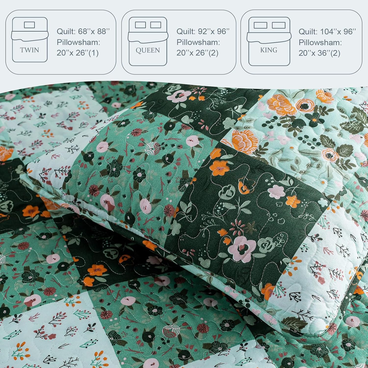 Exclusivo Mezcla Reversible Boho Quilt Set Queen Size, 3 Pieces Patchwork Green All Season Bedspreads, Ultra Soft Floral Coverlet Bedding Set with Printed Pattern (1 Quilt, 2 Pillow Shams)