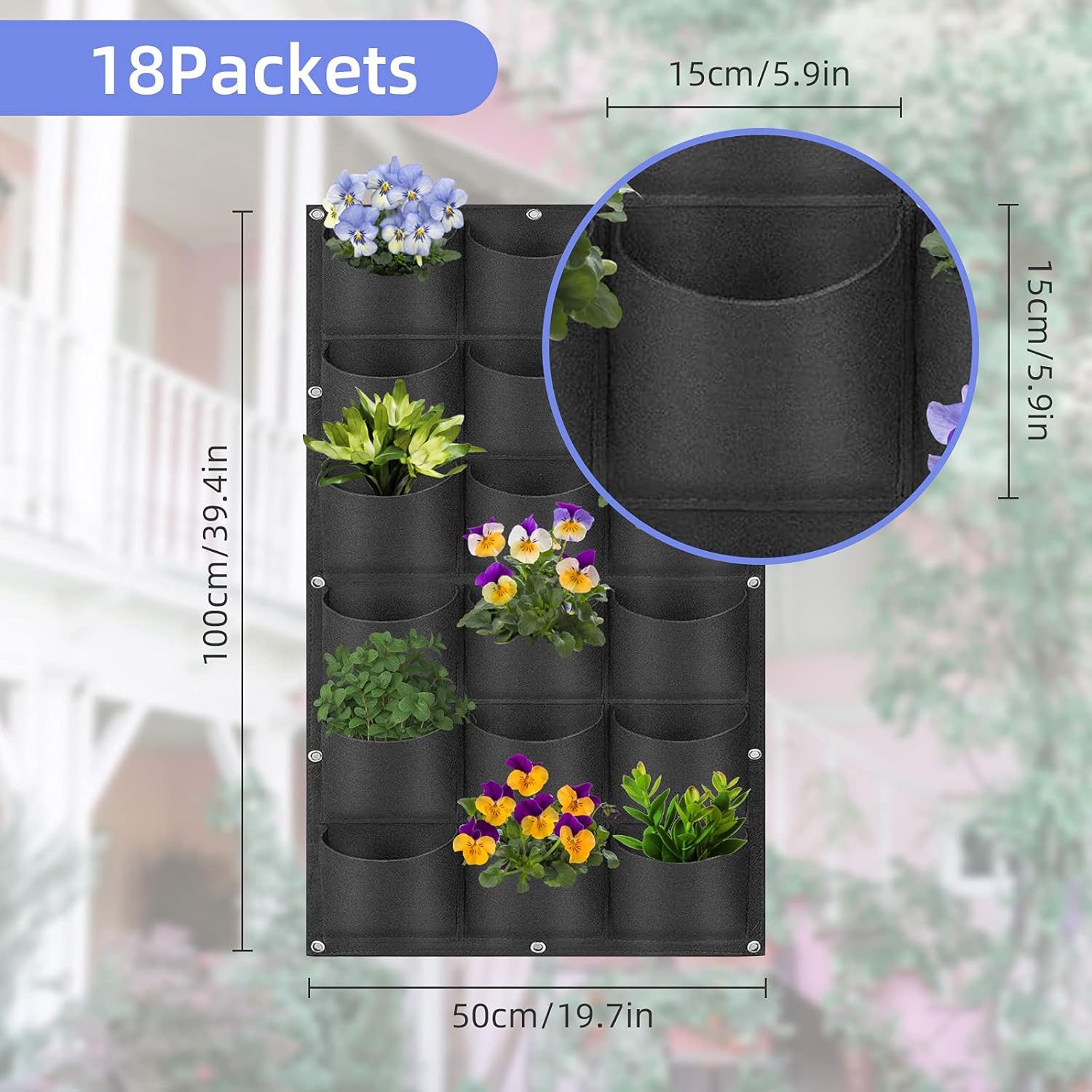 - {Package Included}: 1* 18 pockets Hanging Planting Grow Bags. Size: 100 cm x 50 cm. Strawberry Planters Bag, Wall Planters for Outdoor Plants, Vertical Garden Wall Planters, Living Wall Decorating Planting Bags.
