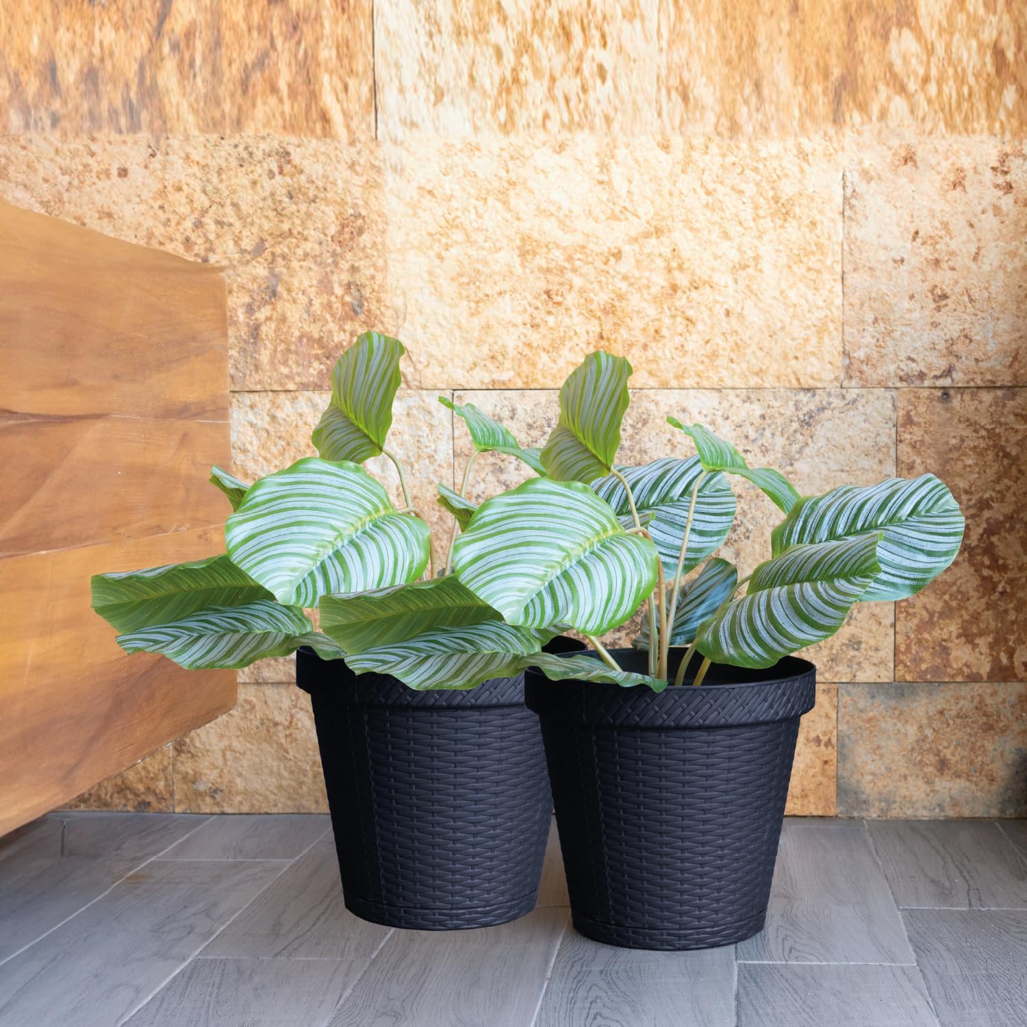 Elly Décor Set of 2 12 inch Round Saucer Modern Self Watering Planter Plates, Pots with Rattan-Like Finish, 12x12 Gray