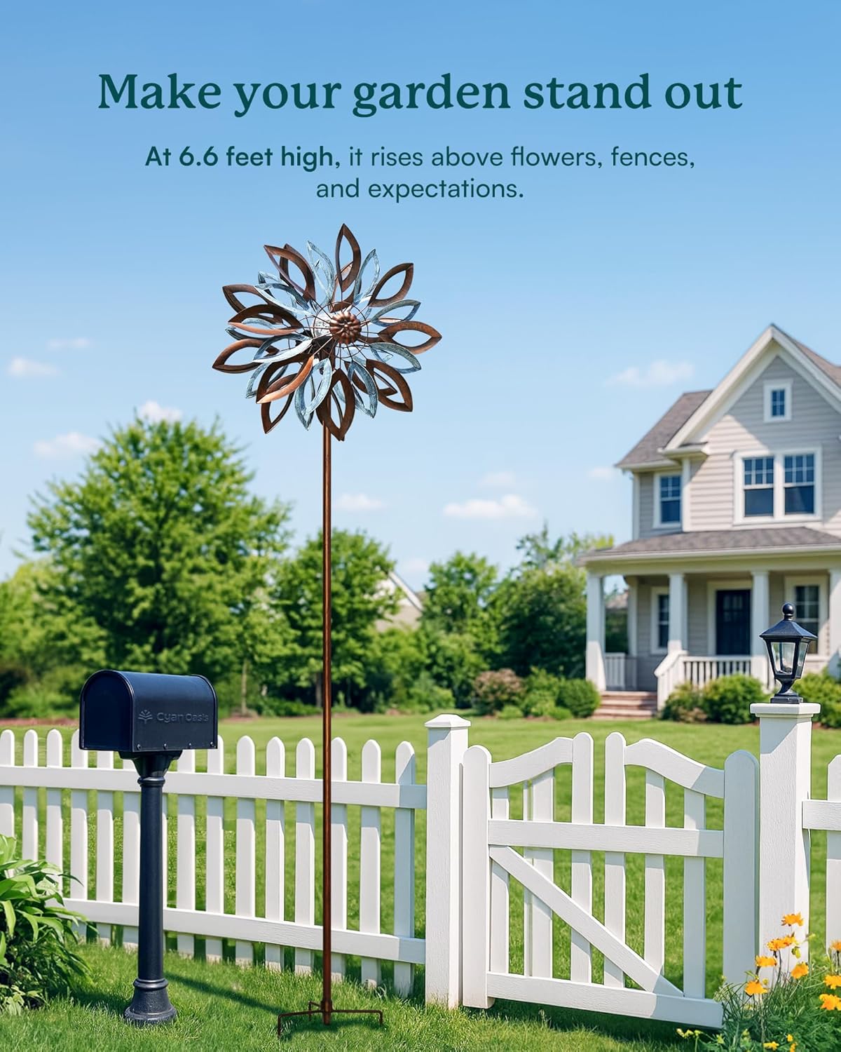 - 【BEAUTIFUL DESIGN】The stunning metal yard spinners features a lovely blend of copper and teal finishes and classical leaves design. Dual rotors spin independently and rotate 360 degrees. The kinetic yard wind spinners has stronger poles (diameter 20mm, 40% thicker than others) and stable metal stake to ensure its firmly planted for windy days and against a snowy landscape.