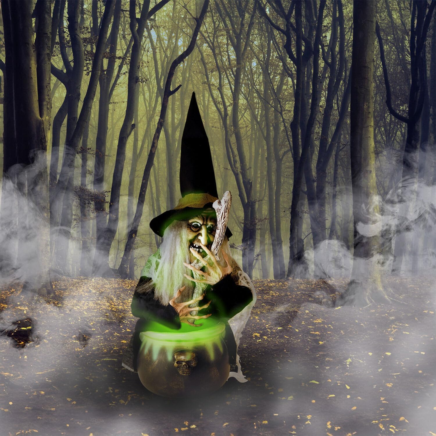 - Tabletop Halloween Animatronic: This witch with cauldron is perfect for indoors or a covered outdoor area so you can display your animated halloween decoration in a variety of different places