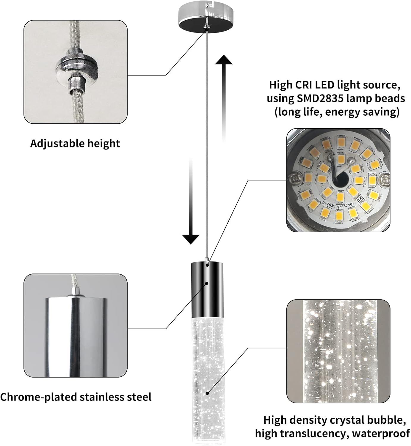 - 【Simple Modern style】:Modern pendant light stainless steel sconces and cylindrical crystal bubble lamp posts will add more luxury, nobleness, and artistic atmosphere to your home, let your island light add a high-end atmosphere to your kitchen.