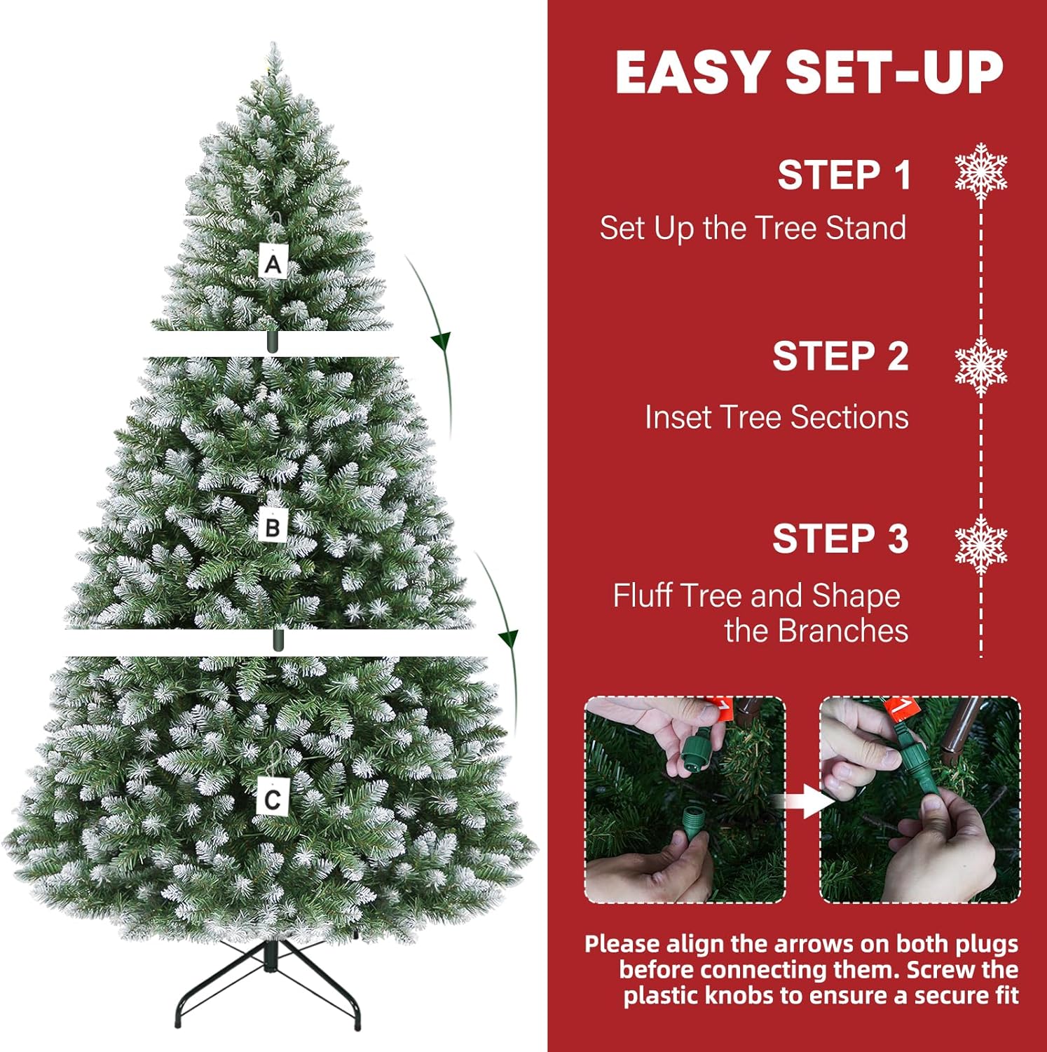 - NATURAL & LUSH LOOK: The 6 ft flocked Christmas tree boasts 1032 branch tips for a full look, pre-strung with 250 warm white LED lights emitting a warm natural glow. Snow sprinkled branch tips create a unique wintry feel. The Christmas tree also provides abundant space to showcase your favorite ornaments.