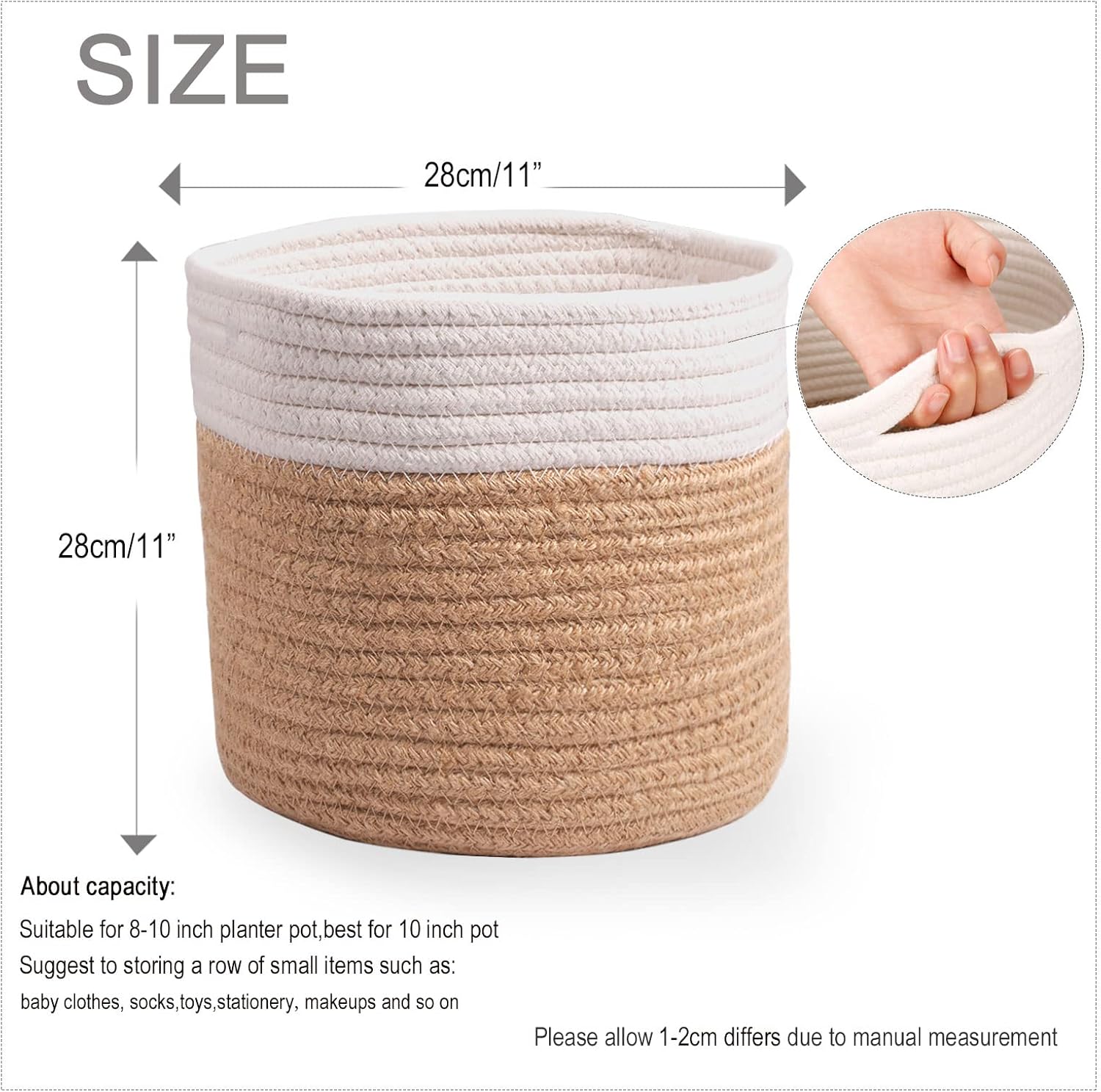 11" Cotton Rope Plant Basket Modern Woven Baskets for 10" Flower Pot Floor Indoor Planters,Storage Organizer Baskets Home Decor,Brown White 11"x 11"
