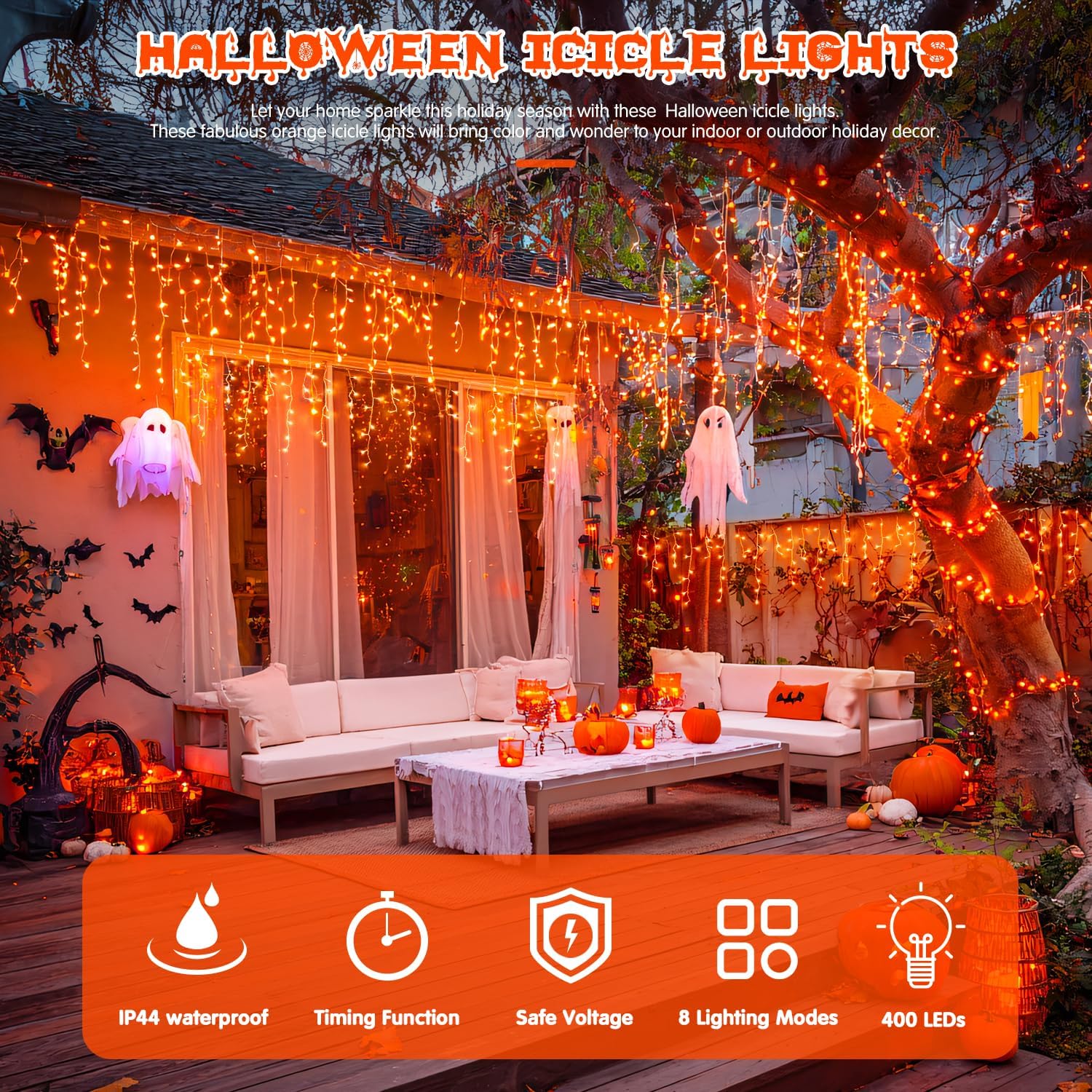 - 【Updated Orange Icicle Lights】 Take your Halloween party to new heights with our 400 LED orange icicle Lights. Featuring an intelligent remote control with four-level dimming capabilities, our orange lights provide versatile lighting options for any occasion. The orange icicle lights are a must-have for adorning the Halloween and infusing the surroundings with an irresistible sense of wonder.