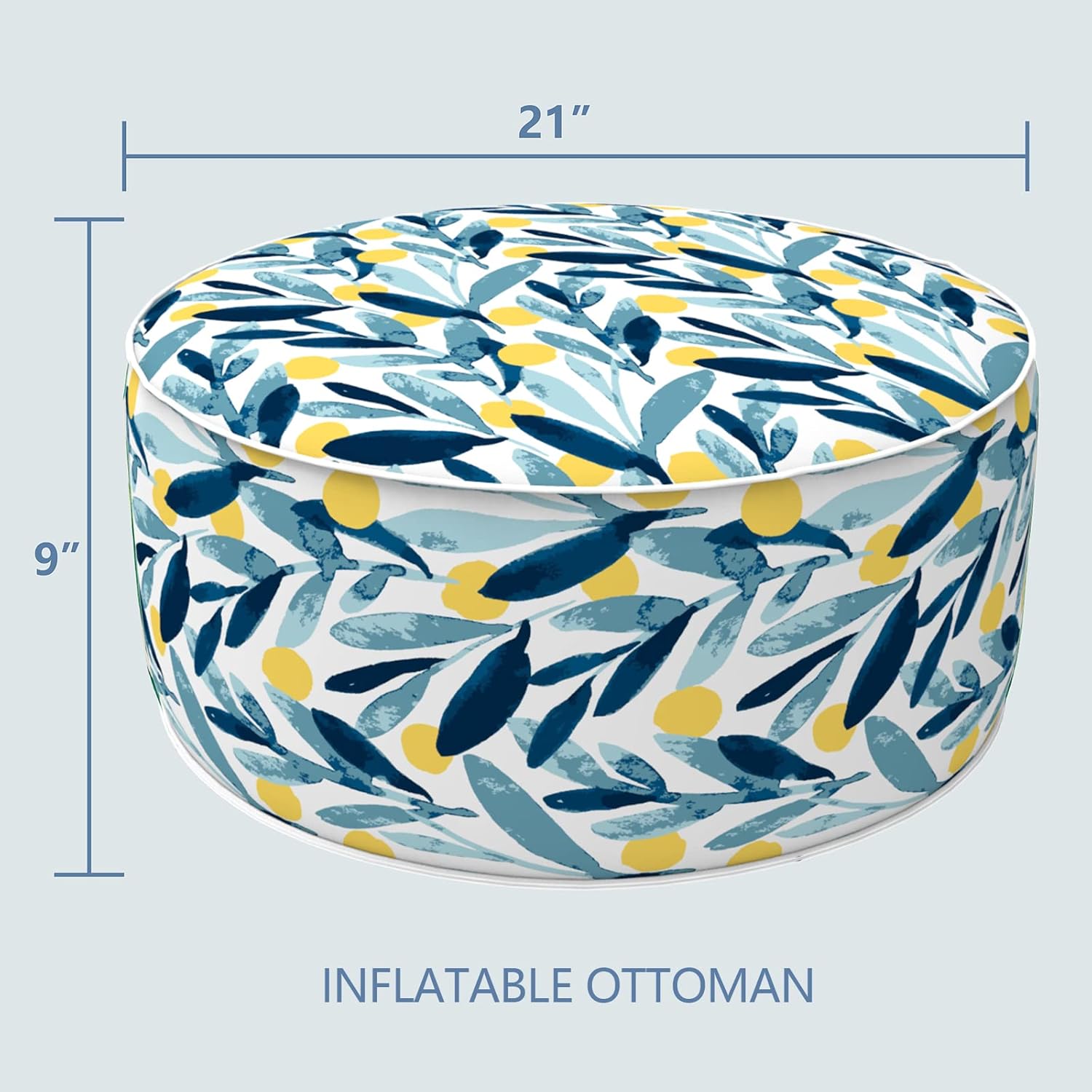 LVTXIII Outdoor/Indoor Inflatable Stool Ottoman, All Weather Patio Footrest Pouf, Portable Round Ottoman for Patio Garden, Camping or Home, D21xH9 Inches, Blue Leaves