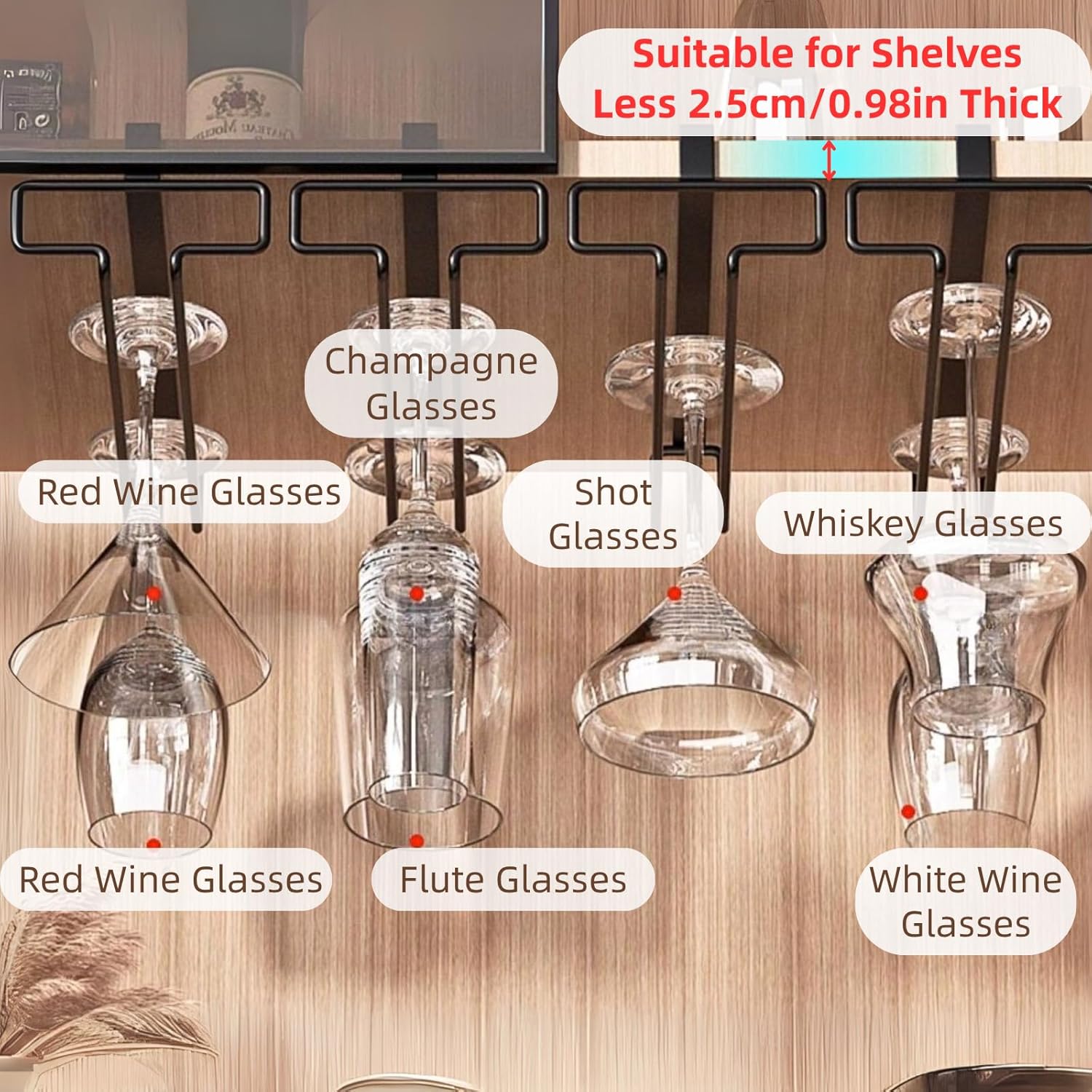 - Space Saving & Easy Access:this under-cabinet wire glass hanging storage rack ensures you have more space inside the kitchen cabinet,partition board, wine cabinet,and it makes your wine glasses well displayed and easy access.Suitable for any shelves with 1inch thickness or less.Please Measure The Thickness Of The Board Of The Shelf Or Cabinet Before Purchase