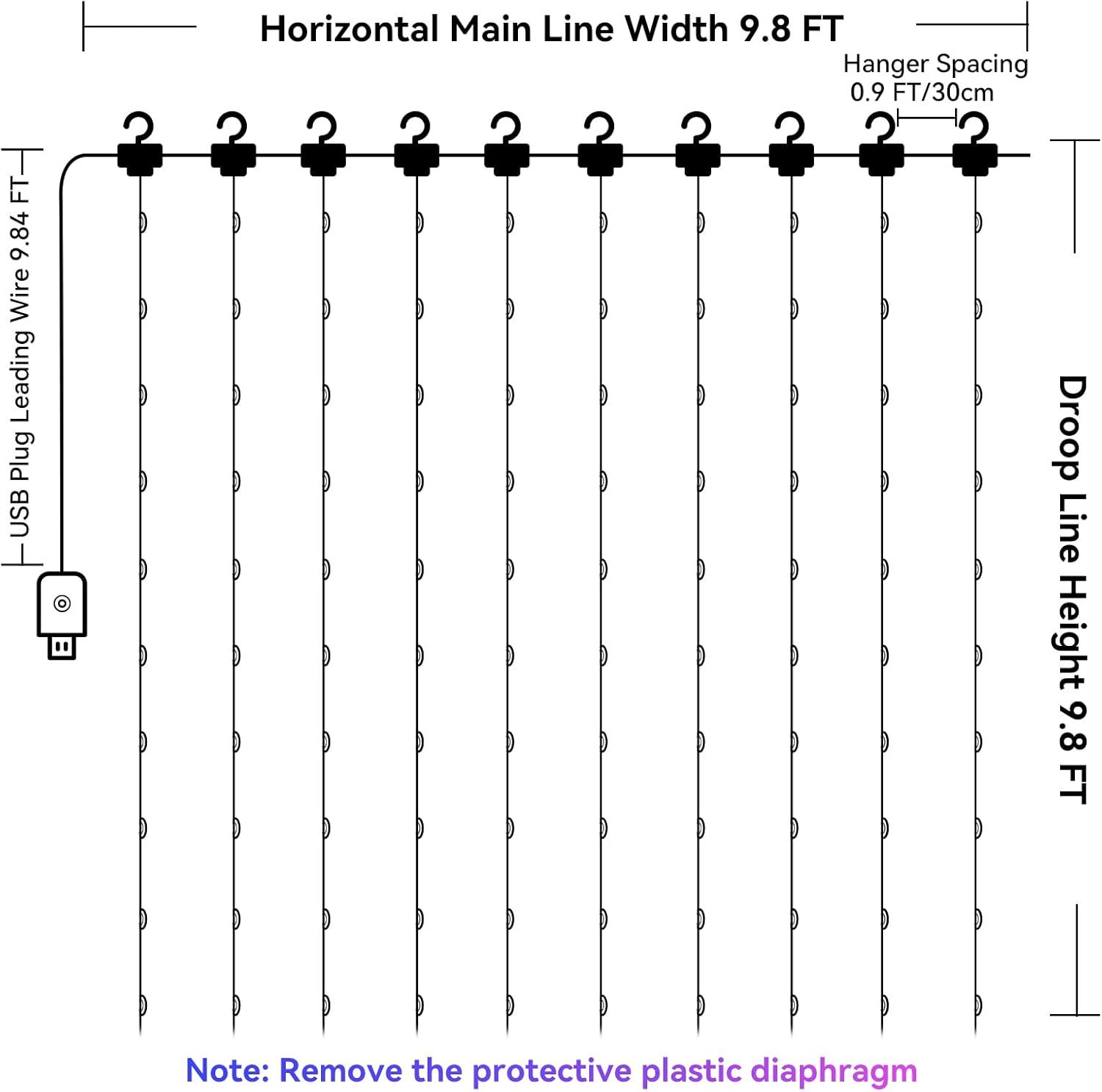 - Color Changing Design: Our 9.8 ft x 9.8 ft curtain lights with 300 LED, the lead wire length 8.2 ft, the spacing between each bulb is 3.9 inch. The mini string lights has the latest color changing design with 16 different colors and 4 lighting modes to meet your different color needs. With 10 pothooks, you can easily hang this fairy string lights on your wall or in your home.