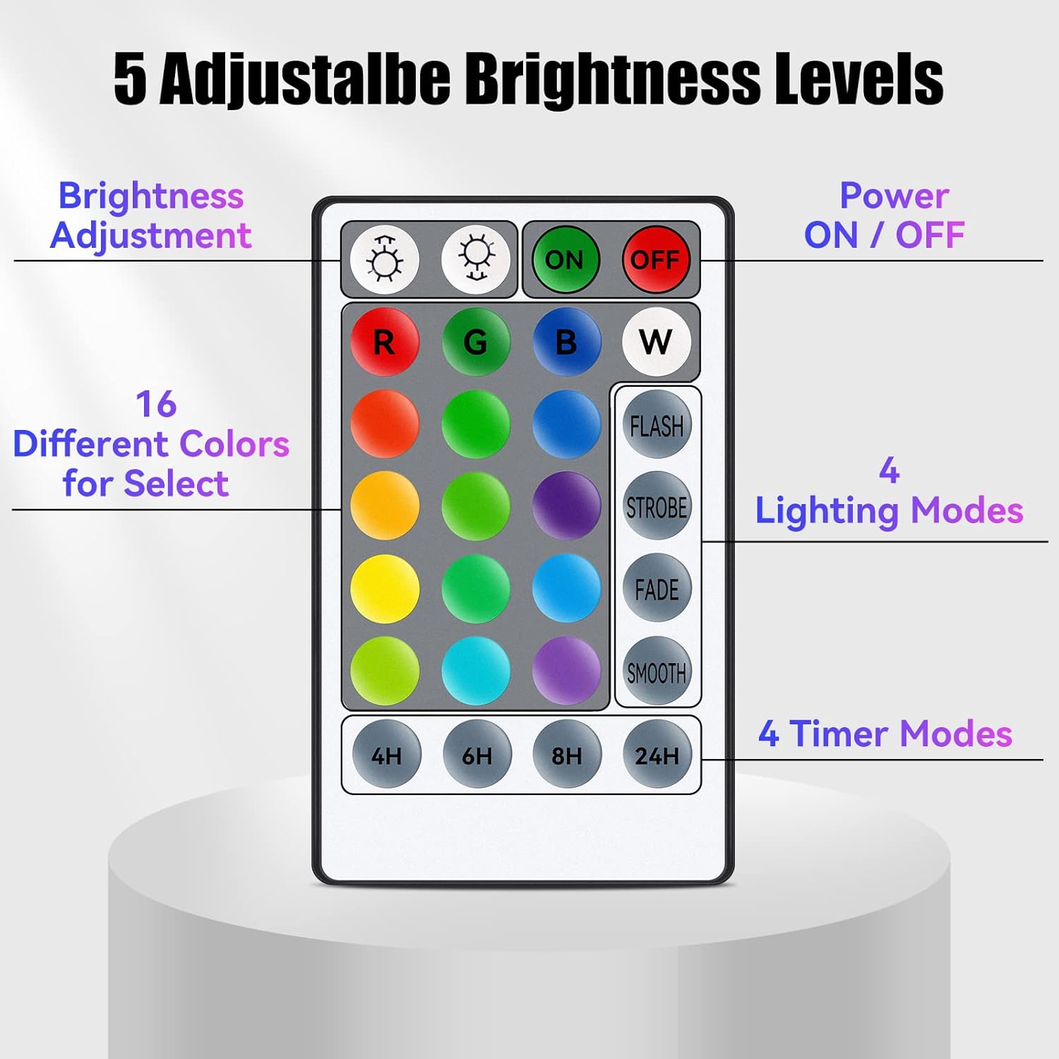 - Functional Remote Control: With this 28 key RGB handy remote, you can choose 16 different colors, 4 light flashing modes like fade, jump, flash, chase. Press "DIM-" and "DIM+" can adjust 4 levels modes of brightness. You can set up the timer: "4H" (4 hours on/20 hours off), "6H" (6 hours on/18 hours off), "8H" (8 hours on/16 hours off), "24H"(always on)