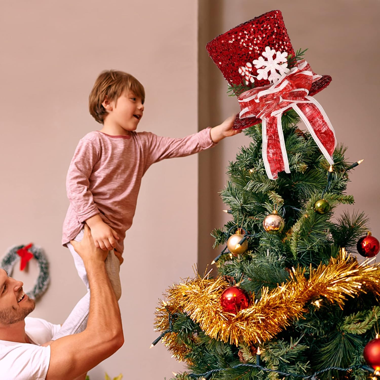Prsildan Christmas Tree Topper Hat, Large Red Sequins Top Hat with Bow Ribbon and Snowflake, Christmas Decorations for Xmas Tree Snowman, Desktop Ornaments Holiday Home Decor