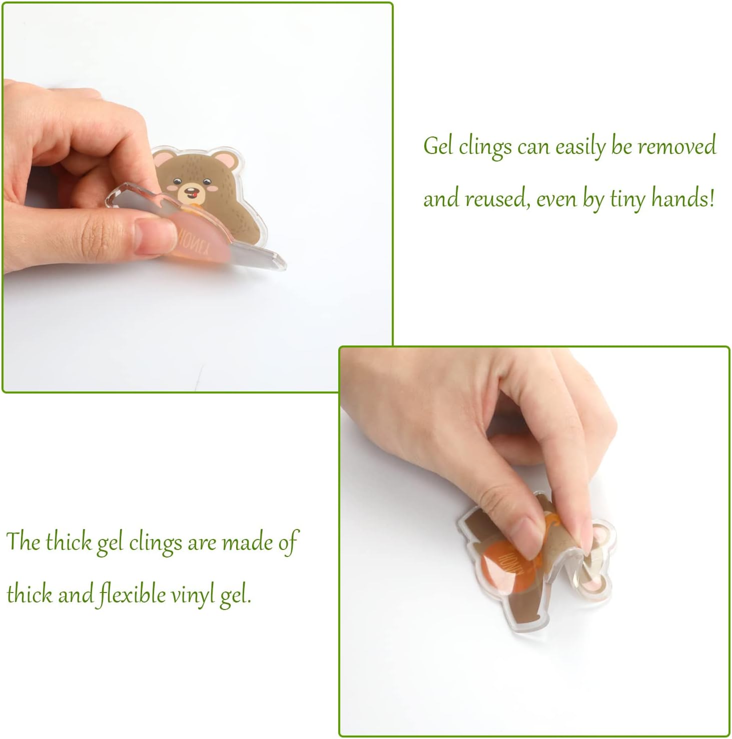 - Note:woodland animals thick gel clings are not edible. These thick gel window clings are suitable for children 5 years and older to play, and there is a risk of suffocation. They need to be accompanied by an adult when playing.