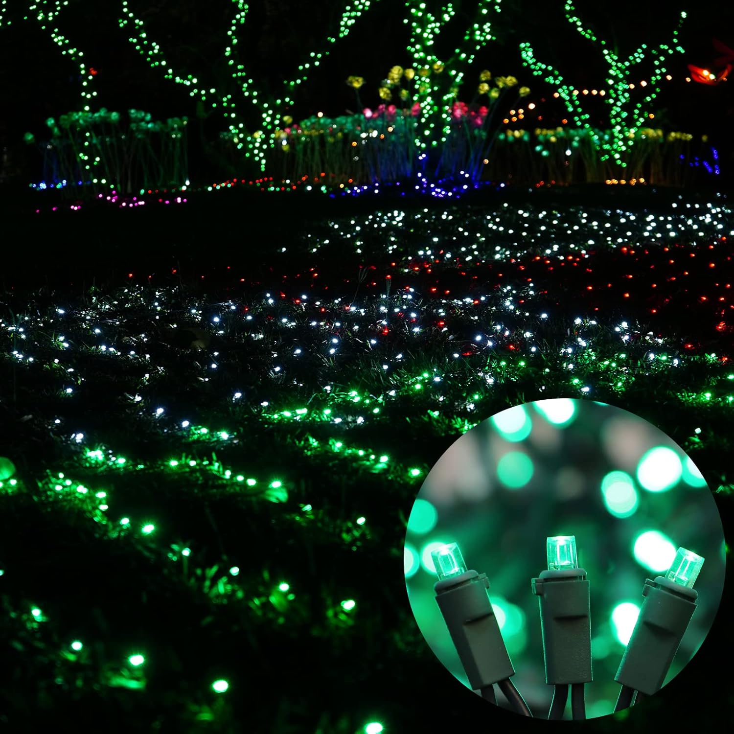 - 5mm LED Christmas Lights: 100 counts warm white 5mm wide angle stable LED string lights spaced 6.3 inches apart with green wire. 7.1 inch leads have a stackable male plug and 5.9 inch tails have a female plug for easy end to end connection.