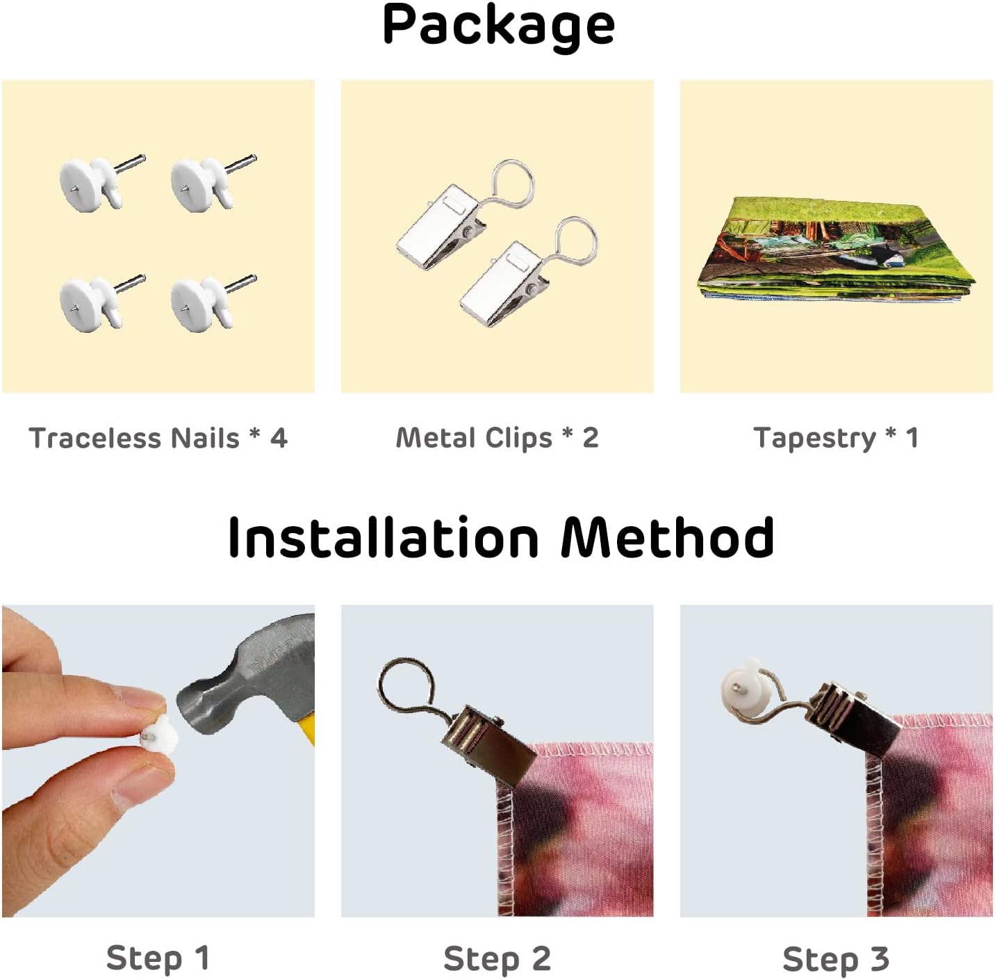 - Package: Package includes 1 Tapestry,4-6 Seamless Nails,2 Clips,which can help you hang up easily.The non-trace design will leave smaller hole and less damage to the wall.