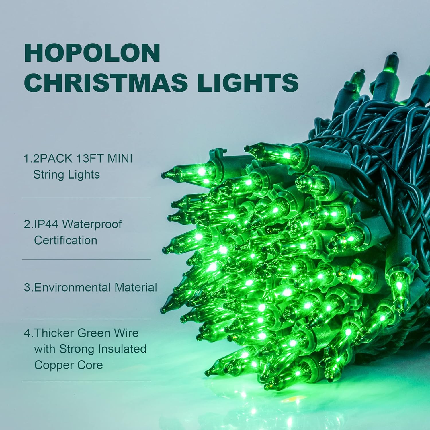 - 🍀2Pack Incandescent Christmas Lights:Hopolon 2 PACK 50L Green Christmas mini lights is 13ft in total-Green wire with Bulbs: 3.5m/11.5ft, cord without lights50cm/1.5ft, spacing between every bulb: 7cm/2.76in. With Thicker green wire with strong insulated copper core, tangle-free to use,High quality UL certified products ensure the safety of you and your family.