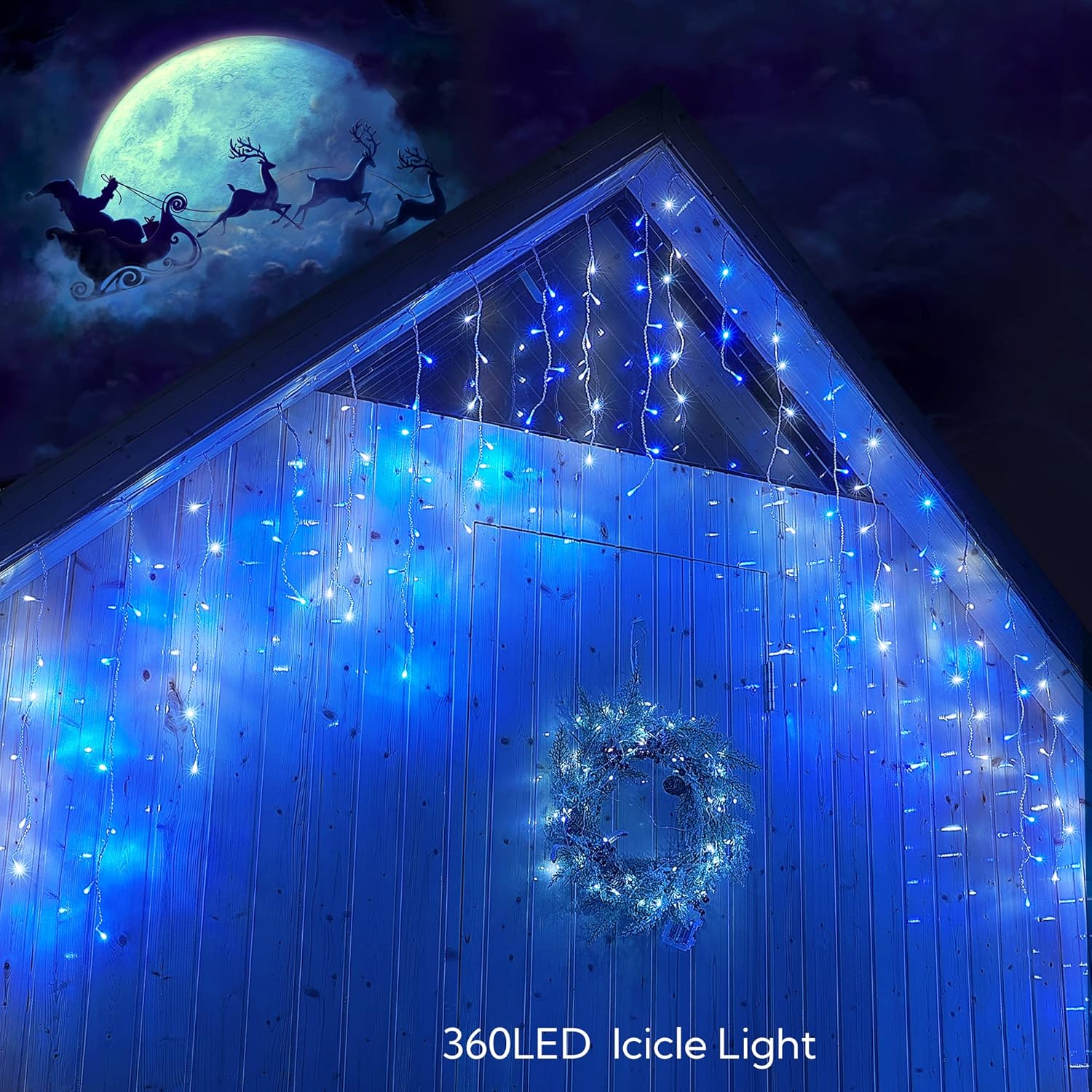 Hopolon 33FT 360L LED Christmas Icicle Lights Outdoor Waterproof,8 Modes Plug in Curtain String LIghts With 60 Drops,Christmas Lights for Wedding,Party,Bedroom,Home,Garden,Wall Decorations(Blue White)