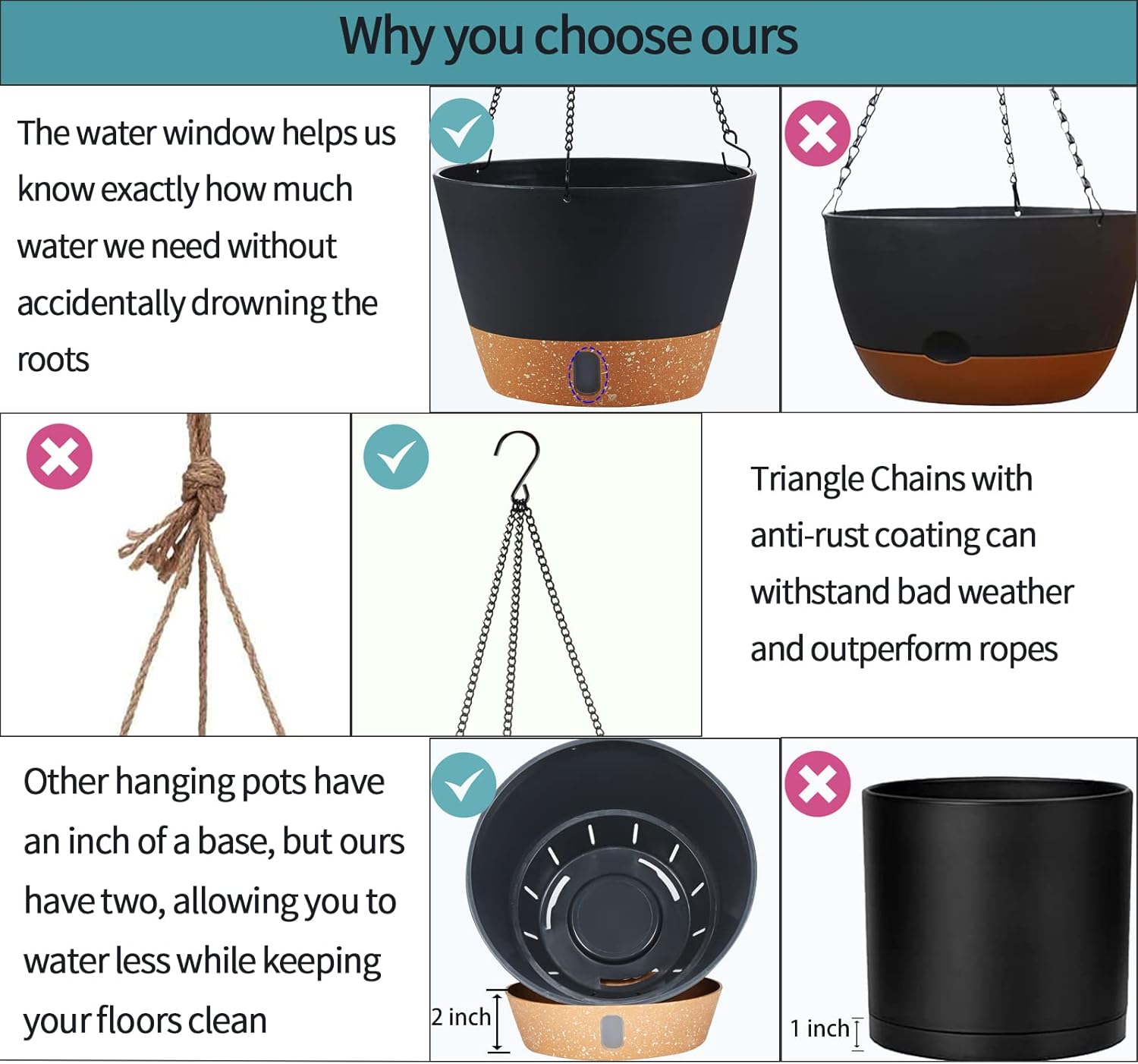 - With Hanging Chain and Hooks:The Chain is made of Stainless Steel and the Surface is plated with an anti-rust coating to further protect the chain from damage. Three Hooks design can increase the stability of the hanging planters. It can withstand inclement weather when used on outdoor plants.