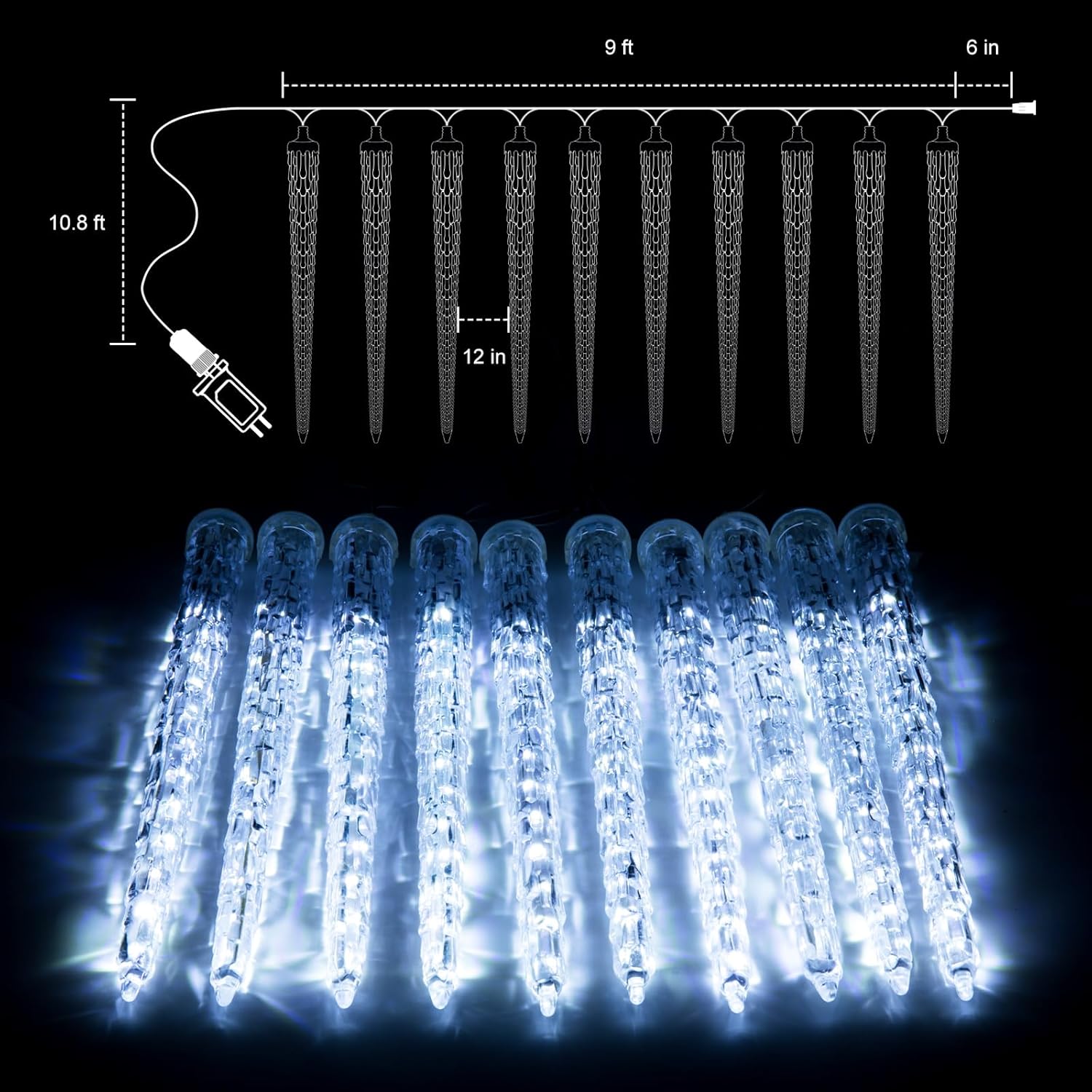 Christmas Icicle Lights Outdoor, 10Ft Meteor Shower Lights with 10 Ice Shaped Tube, Snowfall Shooting Star Light Effect, Falling Crystal Christmas Decorations for House Eave Roofline, Cool White