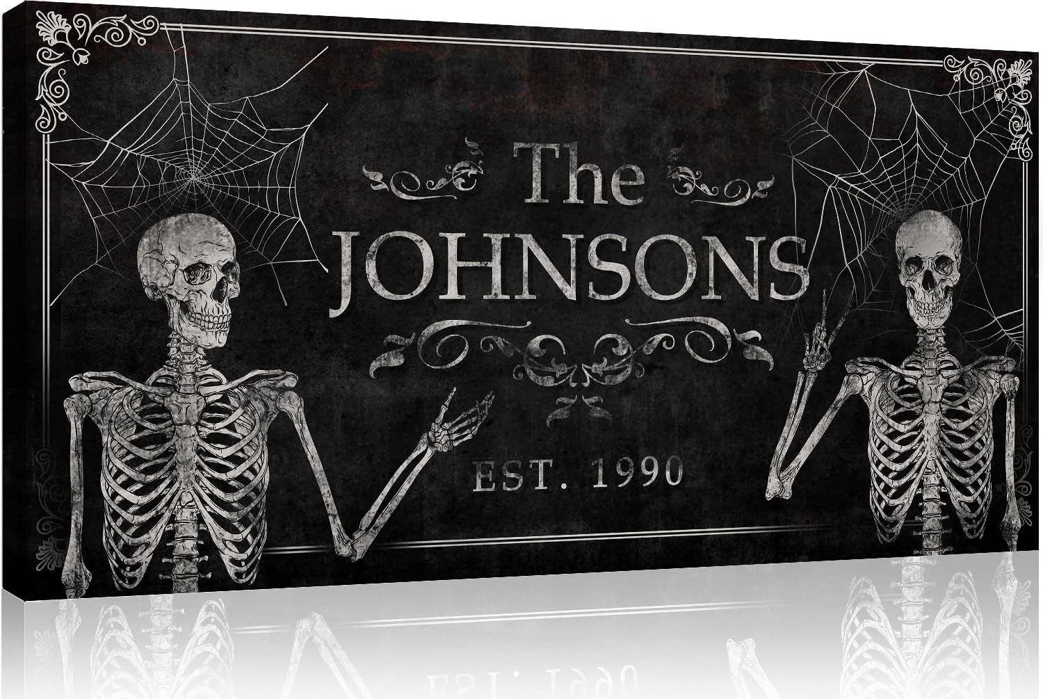 Tailored Canvases Gothic Family Wall Decor - Personalized Grunge Vintage Skeleton Room Decor for Home, Halloween Lovers, Men & Women for Bedroom, Living Room - Custom Couple Name, White Print, 60"x30"