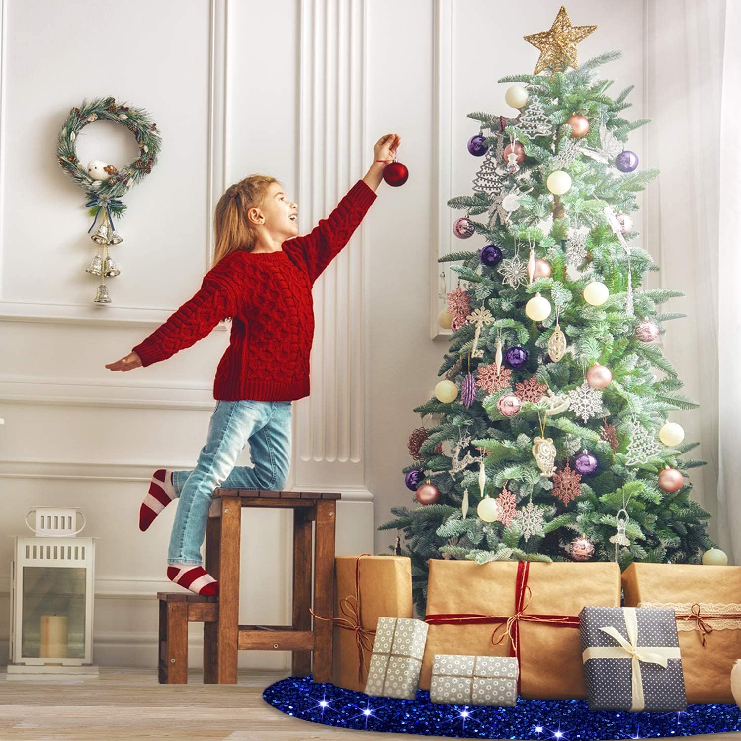 - ❄️【Sturdy Material - Blue Xmas Tree Skirt】Our Chritmas sequin tree skirts are made of premium 5mm sequin fabric and thick velvet material, which can show bright color at any angle. Different from the traditional sequin Christmas trees skirt, this Santa tree mat won't fall off sequins, more elegant and shiny, adding festive fun to your home.