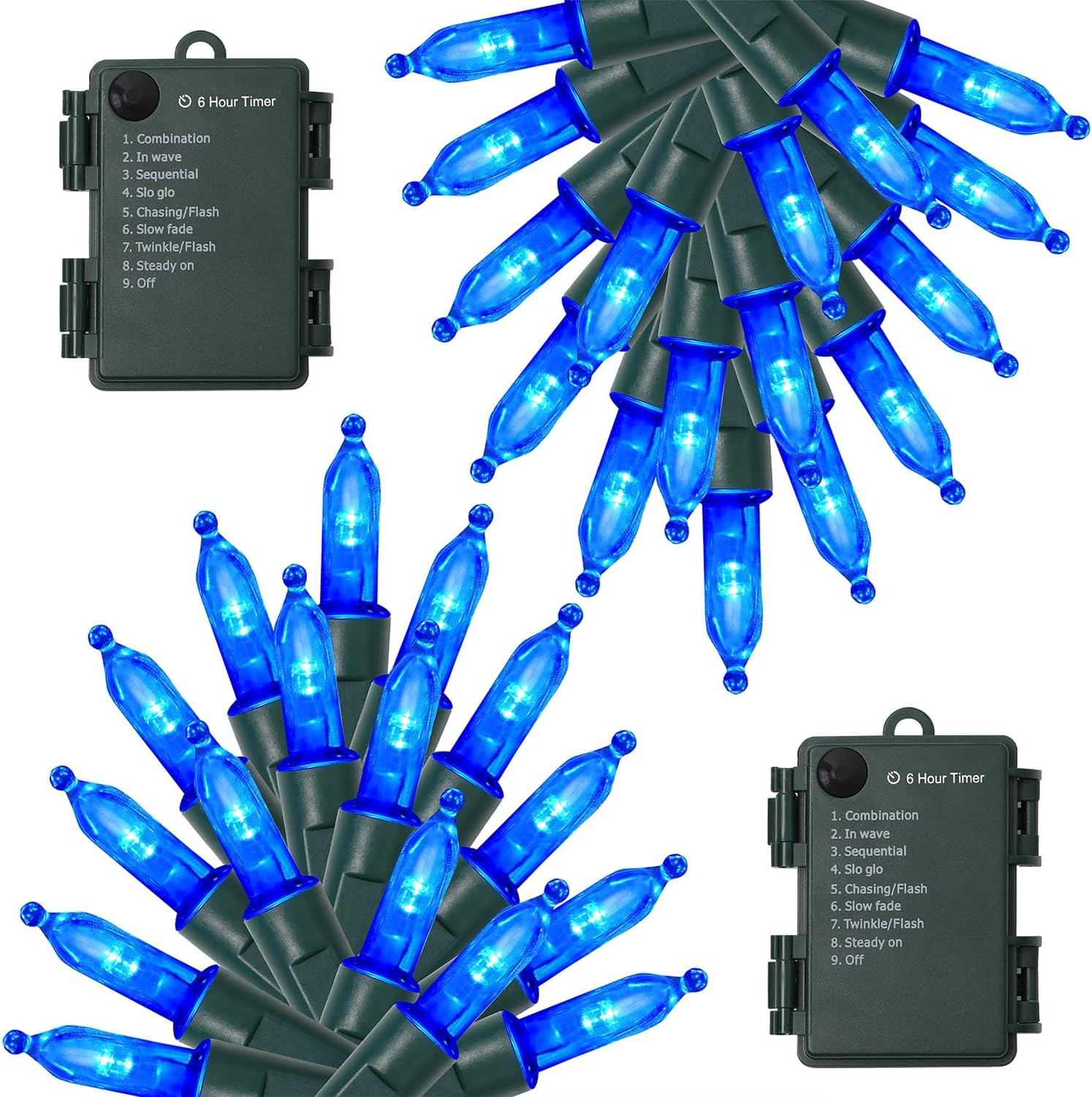 - [8 Lighting Modes]: WATERGLIDE 2 pack 50LED Christmas blue mini string lights have 8 lighting modes for you to choose - Combination, In waves, Sequential, Slow Glow, Chasing/Flash, Slow fade, Twinkle/Flash, Steady on. Adjust the lighting modes by pressing the round button on the battery case