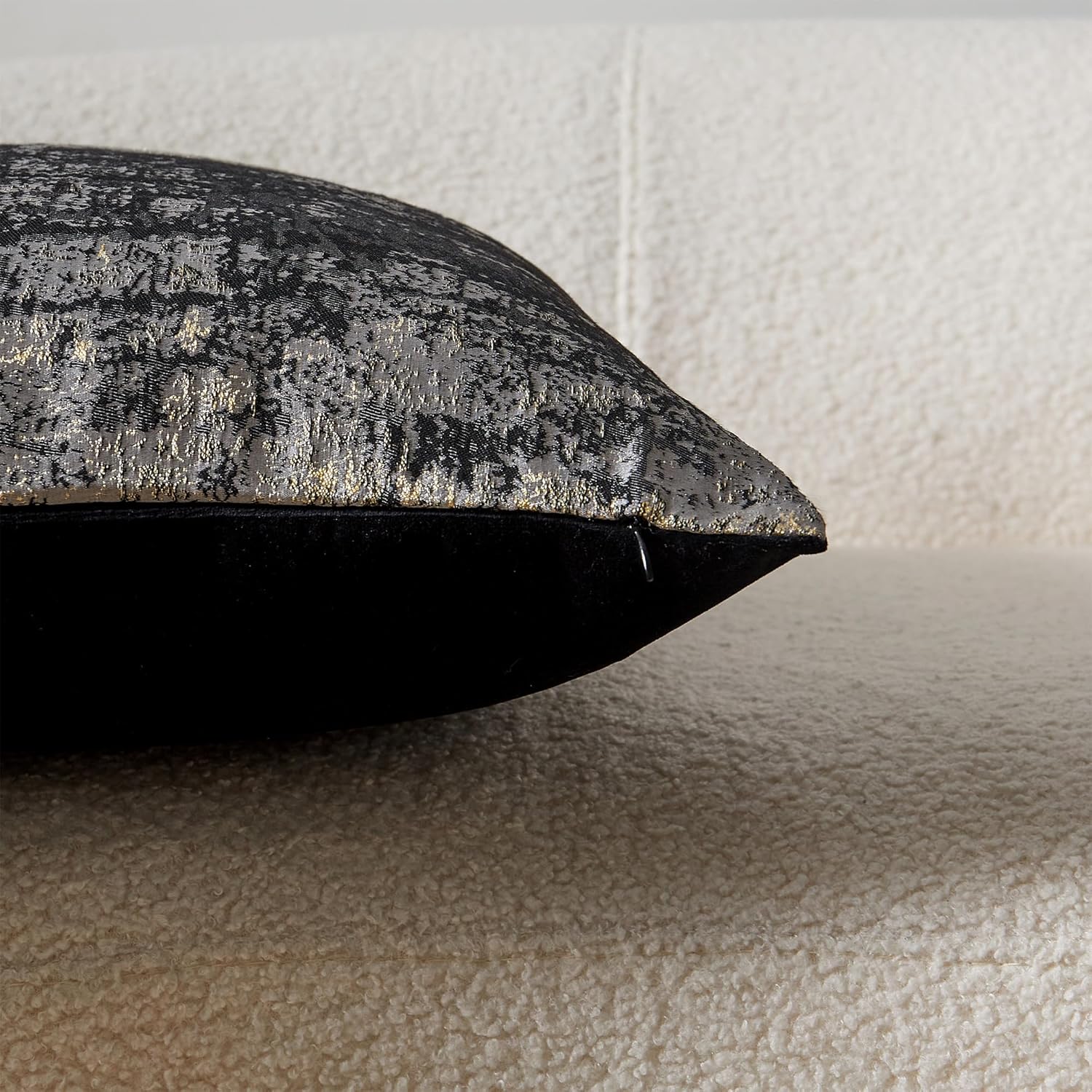 - Premium Jacquard & Velvet Pillow Cover : Crafted with 70% polyester 30% viscose jacquard weave (front) in grey-black with woven gold threads that catch the light, creating a subtle metallic glow. Reverses to 100% polyester black velvet (back) for cloud-like softness. Two looks in one—instantly elevate your sofas, beds, or accent chairs.