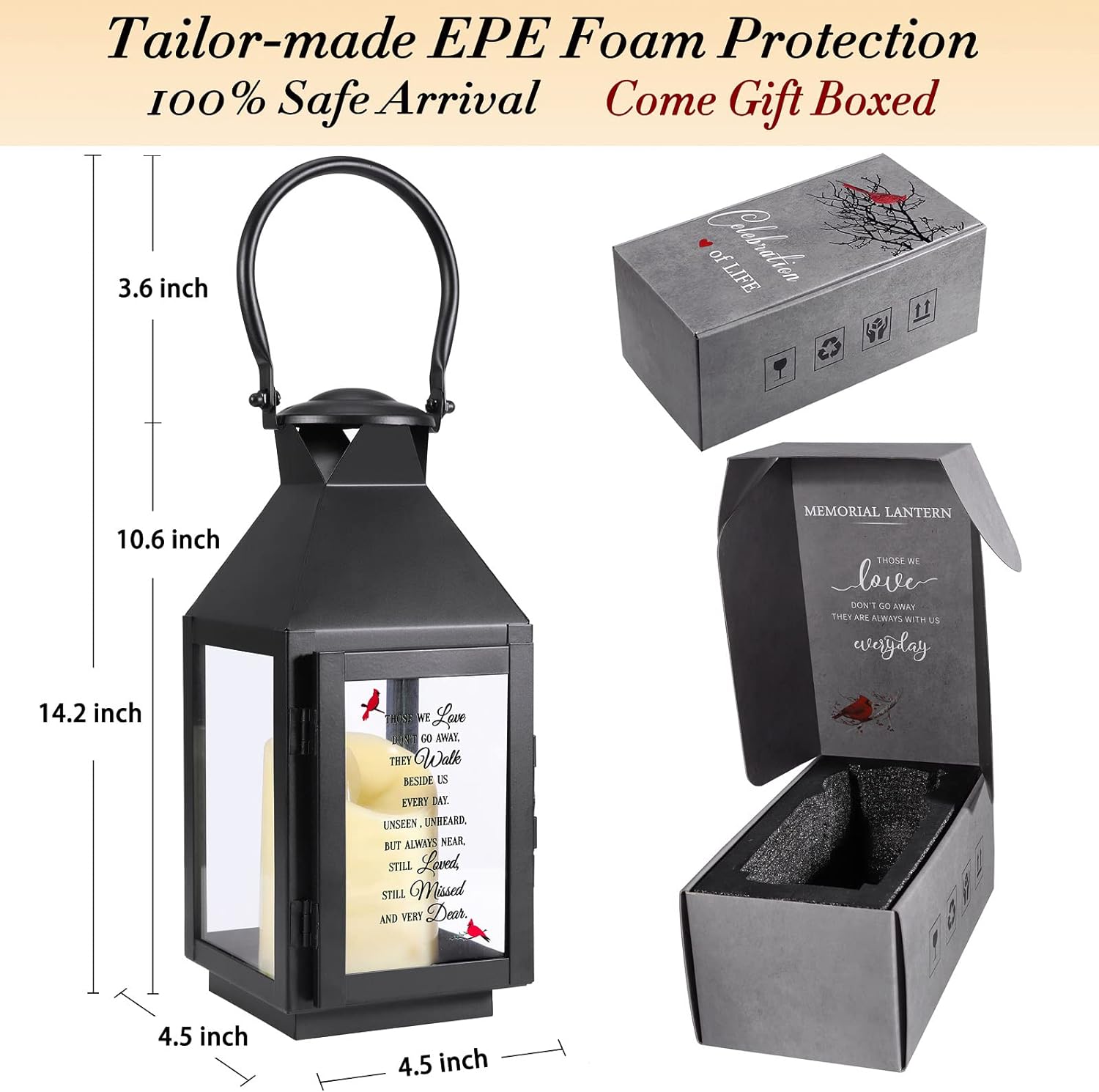 - WELL PACKAGED TO GIFT: The memorial lantern comes with an original designed gift box with inspirational words "celebration of life" and "those we love don't go away". It's also protected by tailor-made EPE foam to make sure nothing is broken.This is a valued memorial gift that will be cherished for years to come.