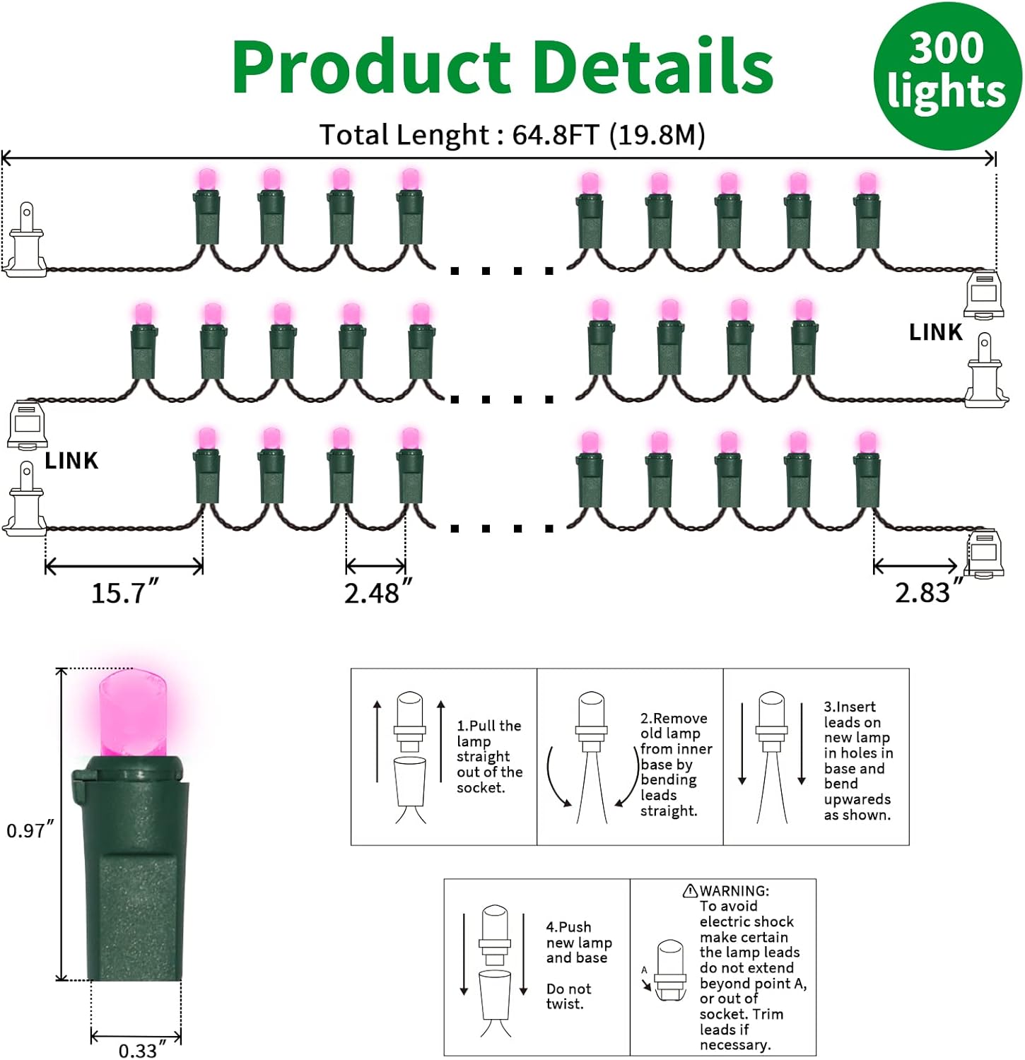 Pink Wide Angle LED String Lights, 64.8 Ft 300 Count, Pack of 3 Strands 21.9 Ft 100 Lights UL Certified Commercial Grade Green Wire 5mm Holiday String Light