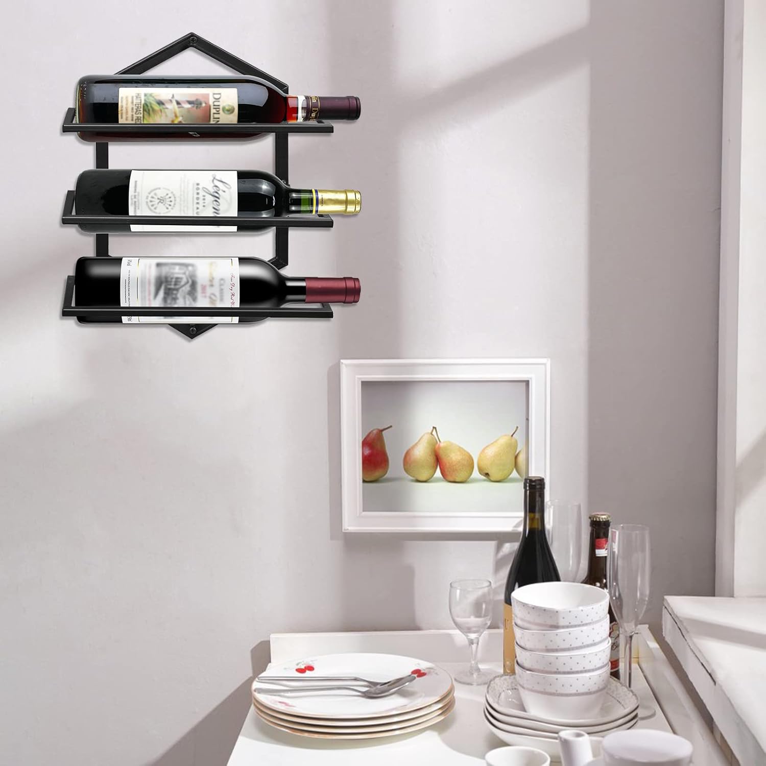 - 【Wine Bottle Display Rack】Our wall mounted wine bottle holder presents your precious wine bottles, goblets in a stylish way, shows a unique artistic atmosphere. Wine rack holds 3 bottles of wine, or champagne.