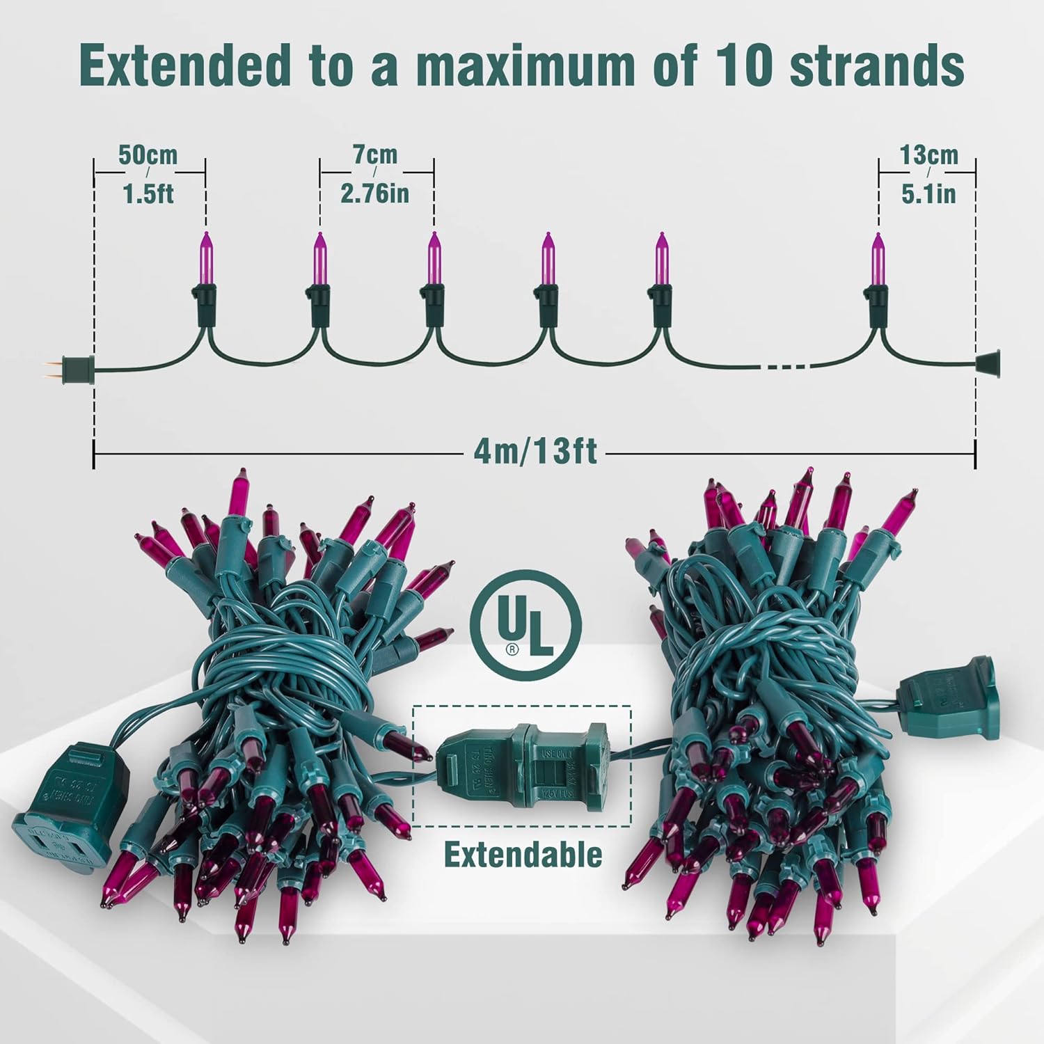 - 🔮Purple Halloween Clear Lights:2PACK 50 count purple string lights, green wire total length 13 feet,19.6 inch leads,5.1 inch tails.Beewin old-fashion incandescent lights would illuminate your Halloween,Christmas and what you want with beautiful color and enough brightness.